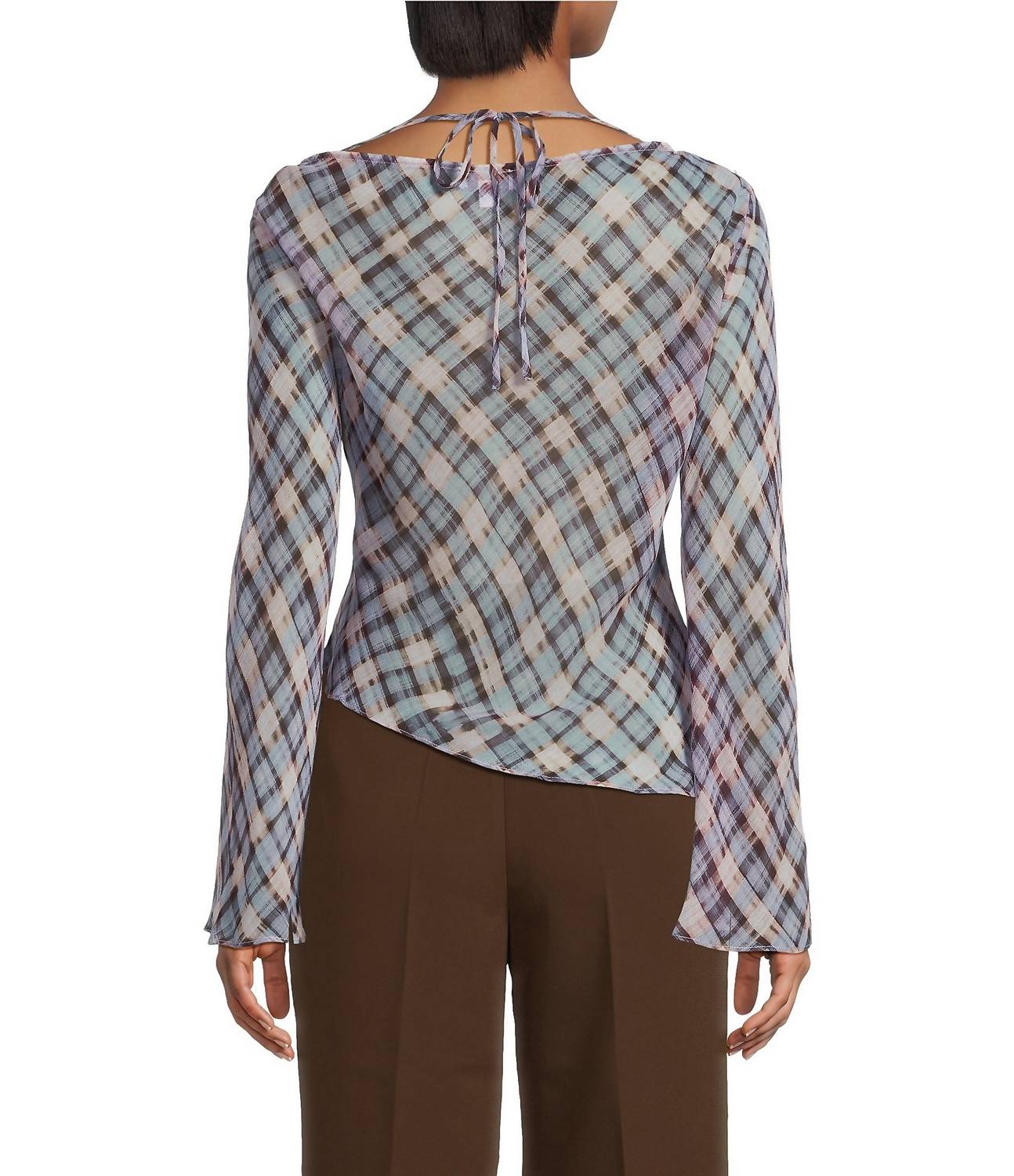 A timeless blouse that will never go out of style. Discover the Joshua Gathered Top by Lucy Paris, a must-have for your spring wardrobe. This women's blouse features long sleeves, a stylish blue and brown plaid print, and a boat neckline. The unique side ruched detail and asymmetrical hemline elevate its Boho Chic vibe, making it perfect for a dinner party. Crafted from woven polyester, it's designed for effortless wear with a pull-on closure and is conveniently machine washable. Imported.