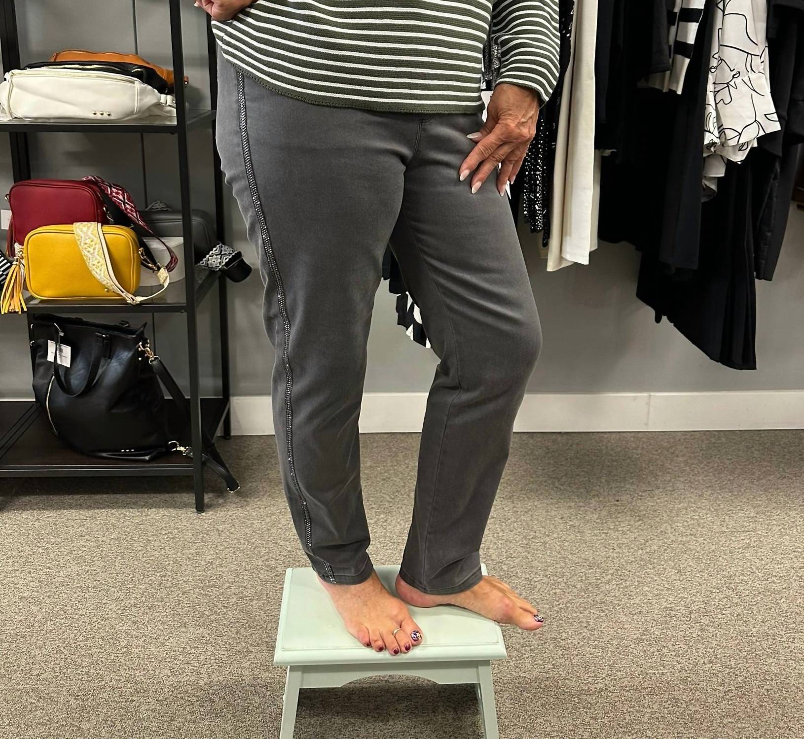 The perfect pant for running around town and looking cool while doing it. Elevate your everyday style with the Lulu-B Studded Sparkle Pants, an essential piece in versatile charcoal. These straight-leg, mid-rise pants feature front and back pockets with a touch of sparkle along the side seam for added flair. Crafted from a soft cotton blend composed of 70% cotton, 27% polyester, and 3% spandex, they boast a comfortable regular fit. Closure: Button closure. Care: Machine wash and tumble dry.