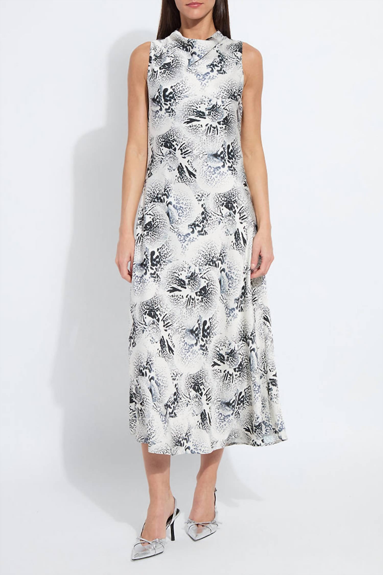 A midi dress so versatile, your options for wearing it are endless. Introducing the Anaya Embellished Dress by Lysse in Winter Orchid, a striking addition to your spring wardrobe. This sleeveless midi dress features a draped cowl neck and is crafted from allover embellished, printed hammered silk-touch satin fabric for a luxe look. Composition: 95% Polyester, 5% Spandex. Closure: Button at the keyhole back. Care: Machine wash. Designed to hit at mid-calf with a 49" length, this dress provides a fitted silhouette that's perfect for travel and inspired by 90s fashion.