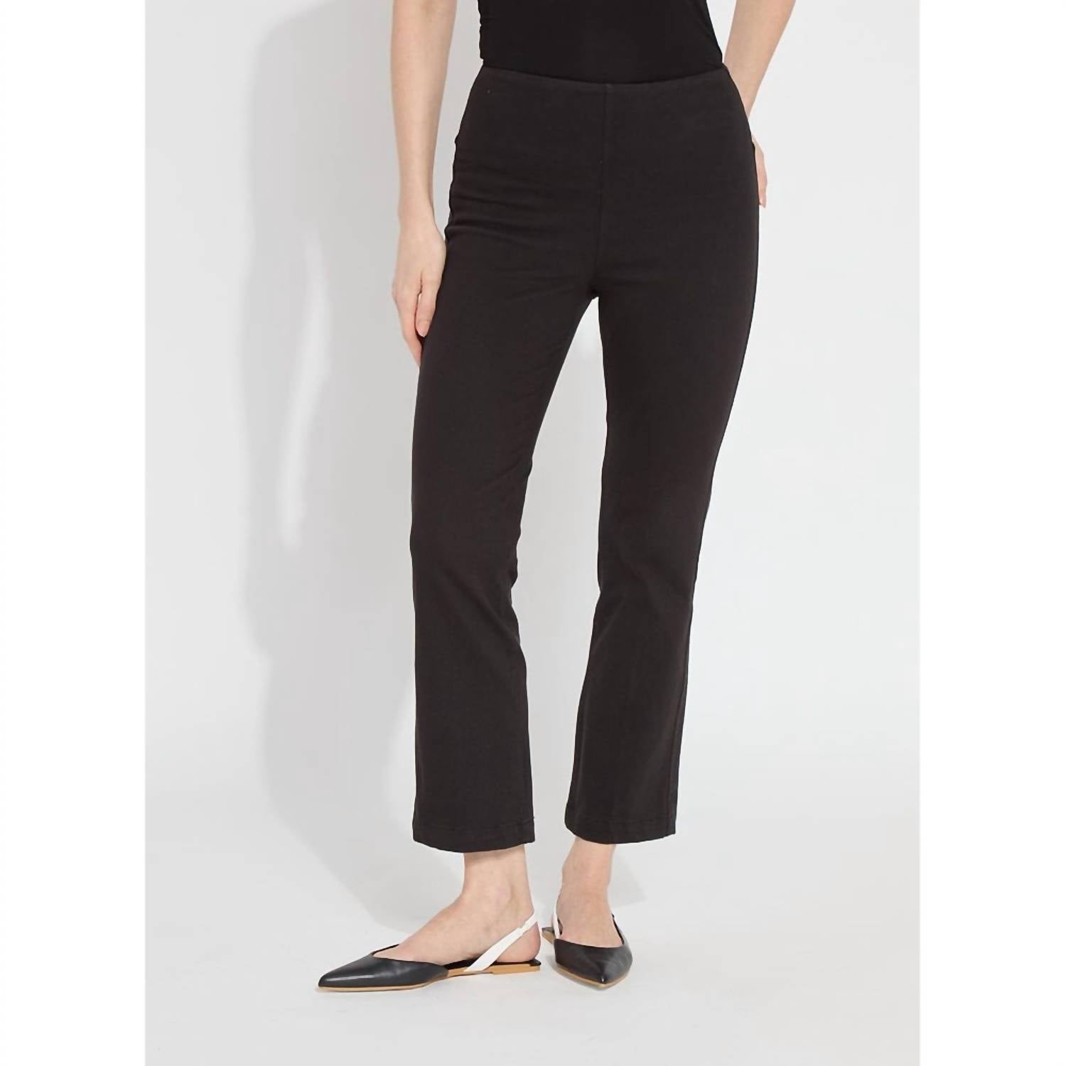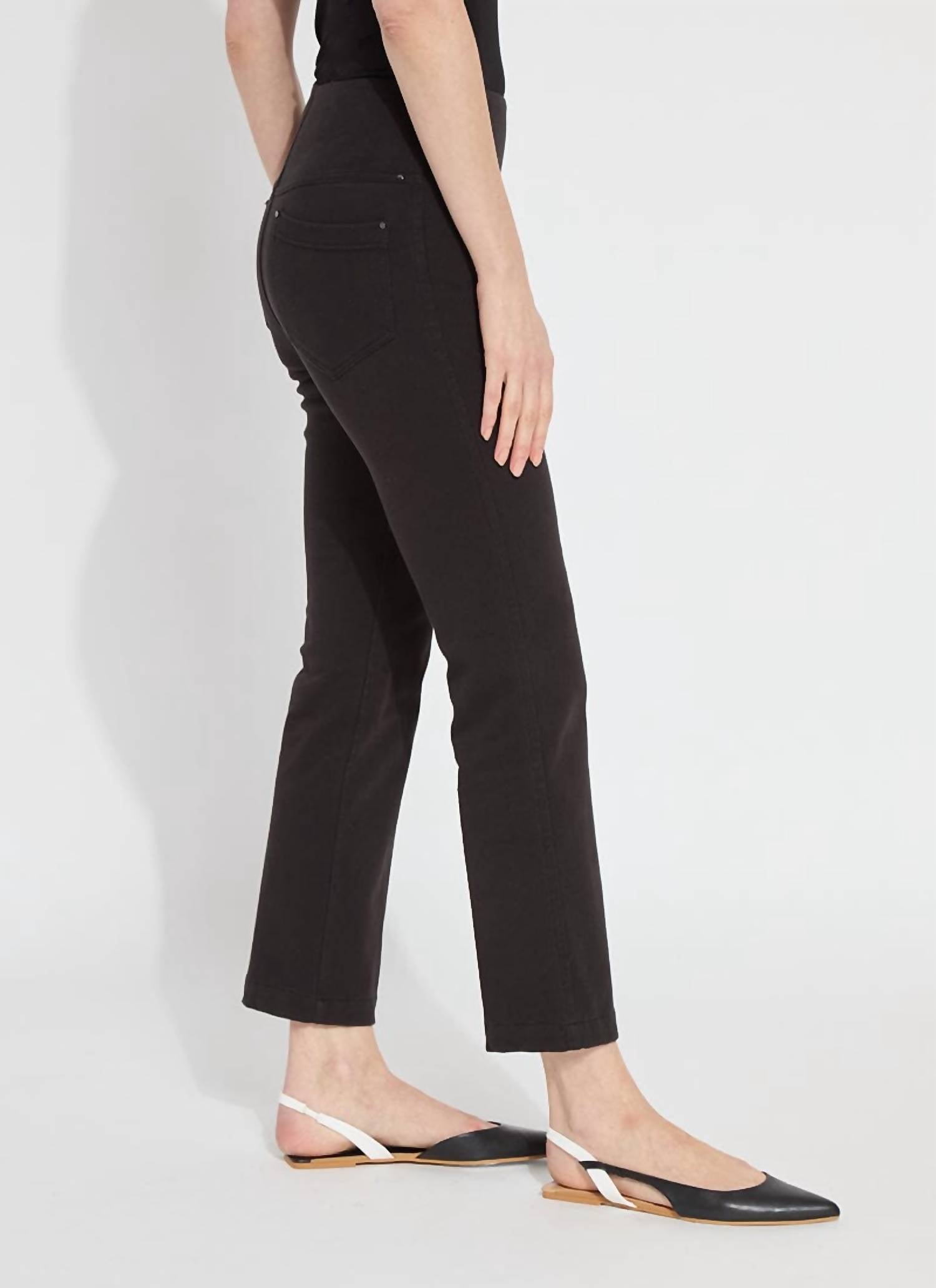 Just add boots! Experience the perfect fusion of style and comfort with the Ankle Denim Baby Bootcut Jeans by Lysse, crafted in a classic black cotton blend. These ankle-length jeans boast a high rise, regular fit with a 10.75-inch rise, and a 27-inch inseam, making them an ideal choice for shorter women. The design features a subtle leg flare, a convenient pull-on closure, and back patch pockets with metal grommets. Made from 95% Cotton and 5% Spandex, these jeans offer four-way stretch for a flattering silhouette and can be easily cared for with machine wash instructions.