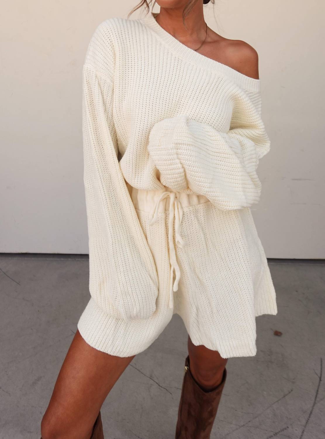 It doesn't take much for this one piece to look effortlessly cool. Add some statement jewelry to dress it up, or throw on some sneakers for a more casual vibe. Introducing the Long Sleeve Knit Romper by MABLE, a chic cream piece perfect for both lounging and outings. Featuring long balloon sleeves and a pull-on closure, this romper is made entirely from cozy acrylic with a textured finish. Designed for a relaxed and flowy fit on the thighs, it is ideal for cooler days or a holiday party. Care for it by hand washing and laying flat to dry.