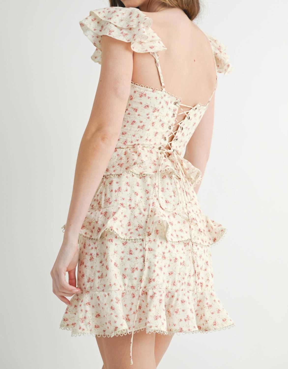 A short and breezy dress for those warmer days. Elevate your spring wardrobe with the Ruffle Mini Dress by MABLE, perfect for a Boho Chic vibe. This cream and pink patterned dress features cap sleeves and adjustable straps, with ruffle and corset details that lace up at the back. A-line in silhouette and ideal for holiday parties, it comes equipped with an invisible back zipper for seamless wear. Composition includes a lining, with care recommendations for dry cleaning to maintain its pristine condition.
