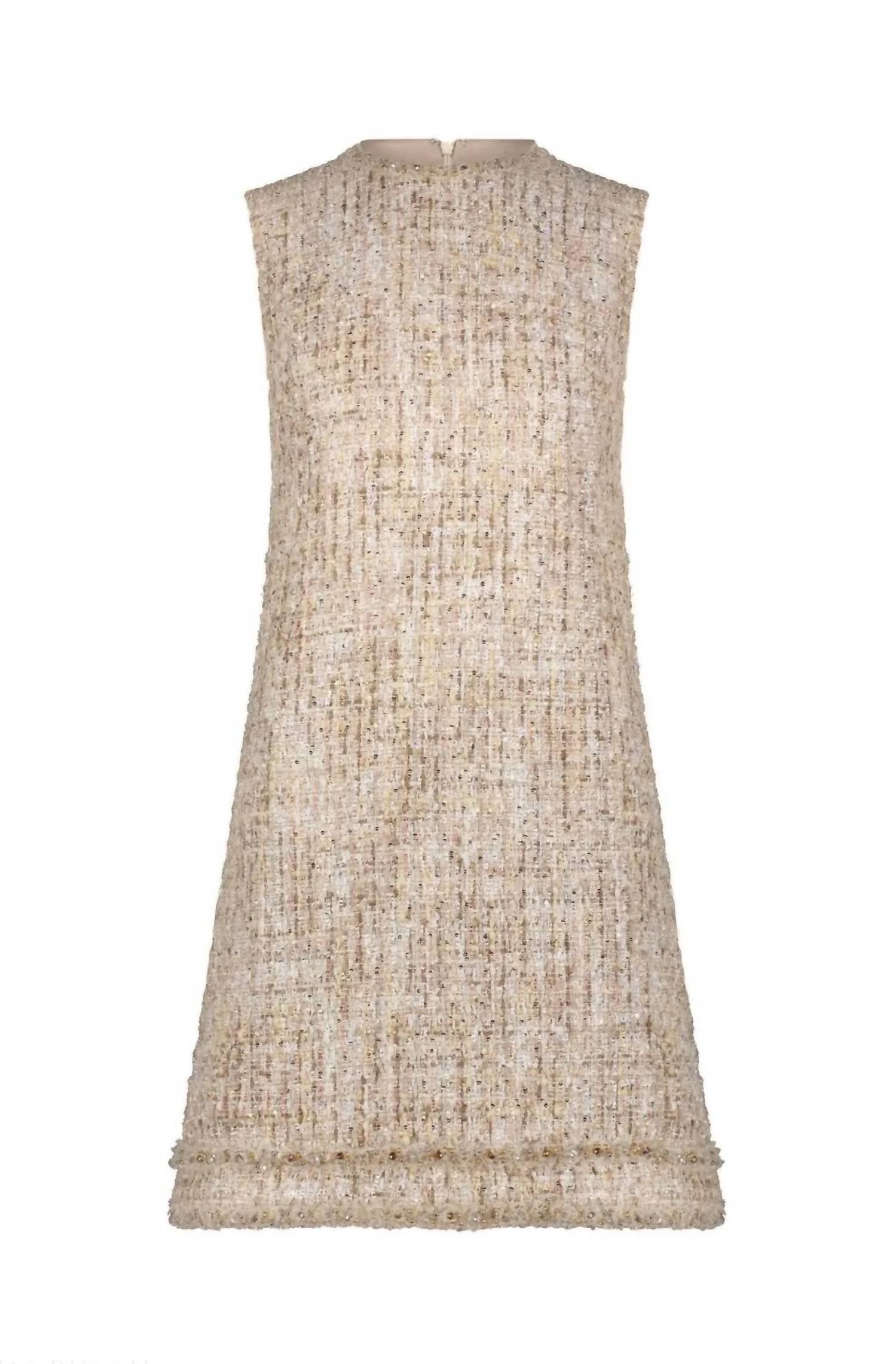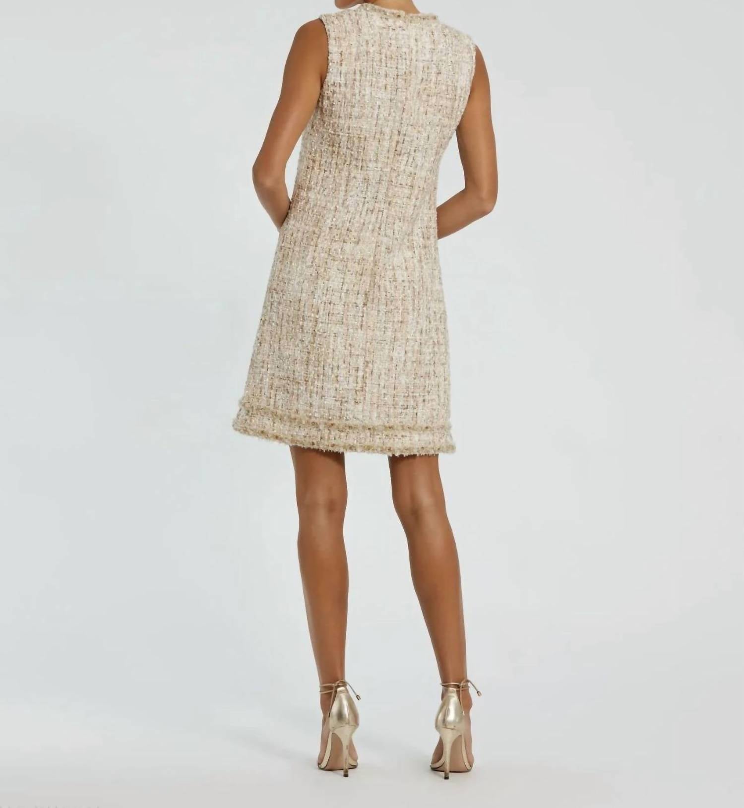 The kind of easy and flattering dress you'll be reaching for all season long. Elevate your style with the Mac Duggal Beaded Trim A-line Mini Shift Tweed Dress, a chic and sophisticated choice in a dreamy blush hue. This sleeveless boucle dress, crafted from 100% polyester, offers a flattering A-line silhouette with a modern shift design. Originating from the USA, it features a concealed back zipper closure for a sleek finish. The garment is approximately 35 inches in length and care must be taken to dry clean only.