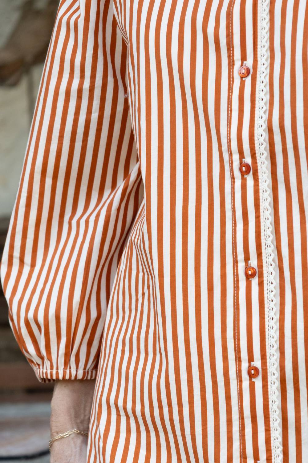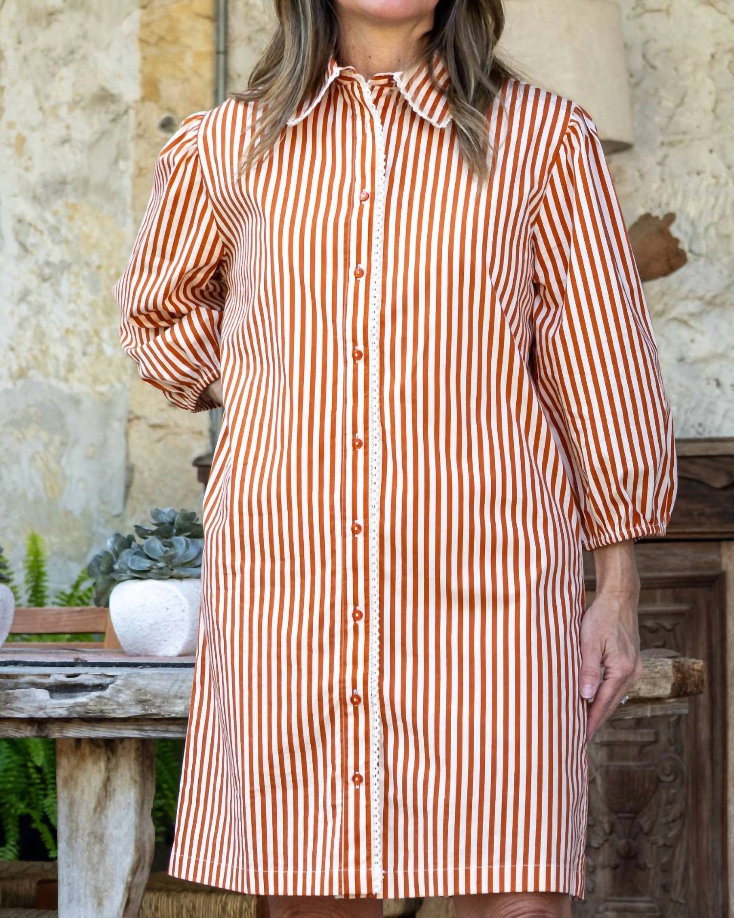 The kind of easy and flattering dress you'll be reaching for all season long. Elevate your vacation wardrobe with Mahila's Stripe Mini Dress in terracotta and white, embodying a playful yet sophisticated shirt silhouette. This women's dress features three-quarter length sleeves adorned with delicate lace trim along its collar, and a button front closure. Perfect for spring outings, it combines a hint of vintage flair with effortless style. Care instructions include machine wash and line dry for easy maintenance.