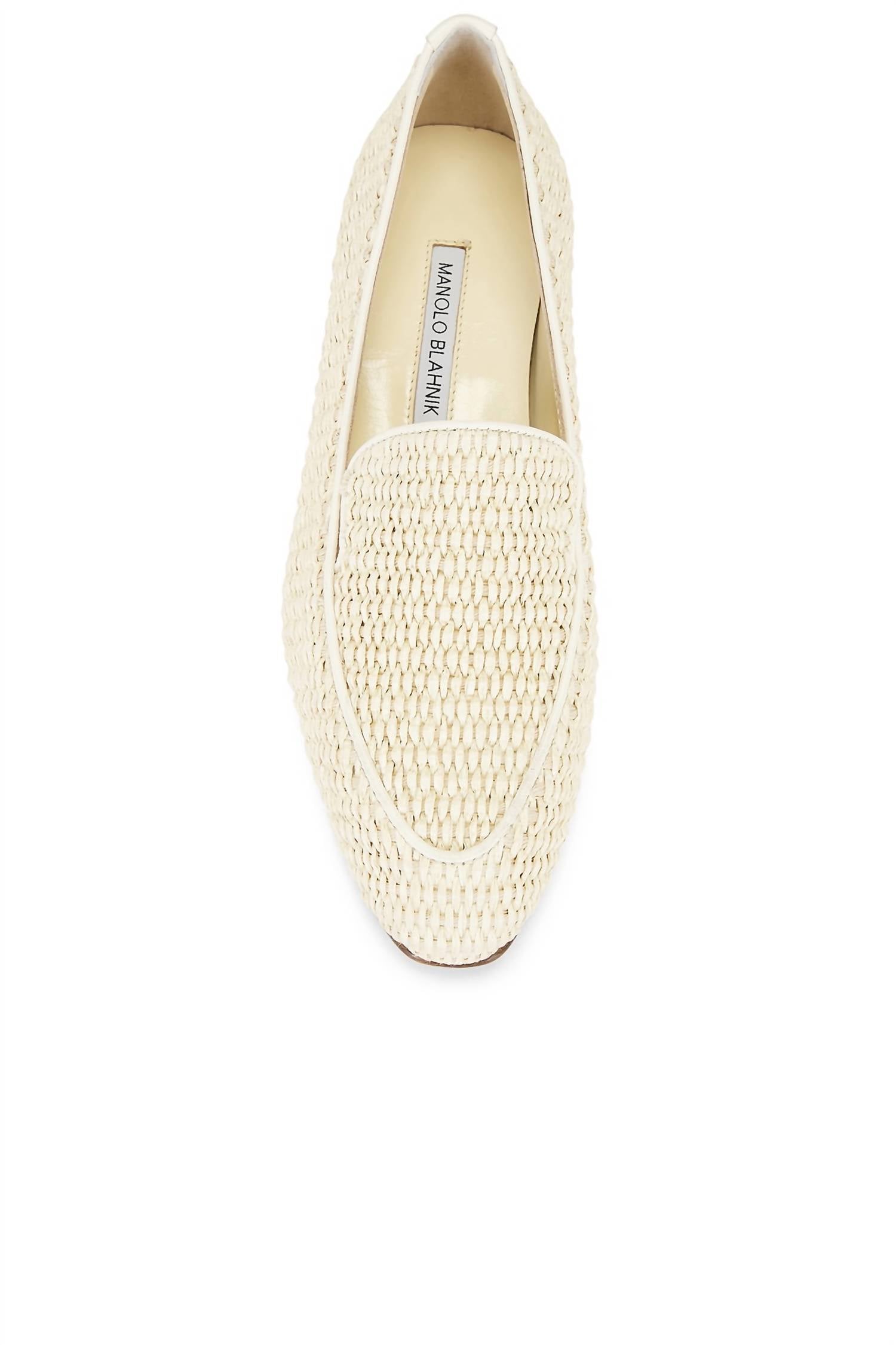 A classic loafer that is both comfortable and polished. Elevate your summer wardrobe with the Women's Pitakara Loafer by Manolo Blahnik, a luxurious blend of style and comfort. These slip-on loafers feature a raffia upper with nappa trim and a calf leather sole, complemented by a kid leather lining for ultimate softness. Designed with a chic almond toe and a flat stacked heel approximately 10mm/0.5 inches high, these shoes are perfect for a vacation vibe. Made in Italy, this stylish pair is presented in a Light Khaki and Light Cream color palette.