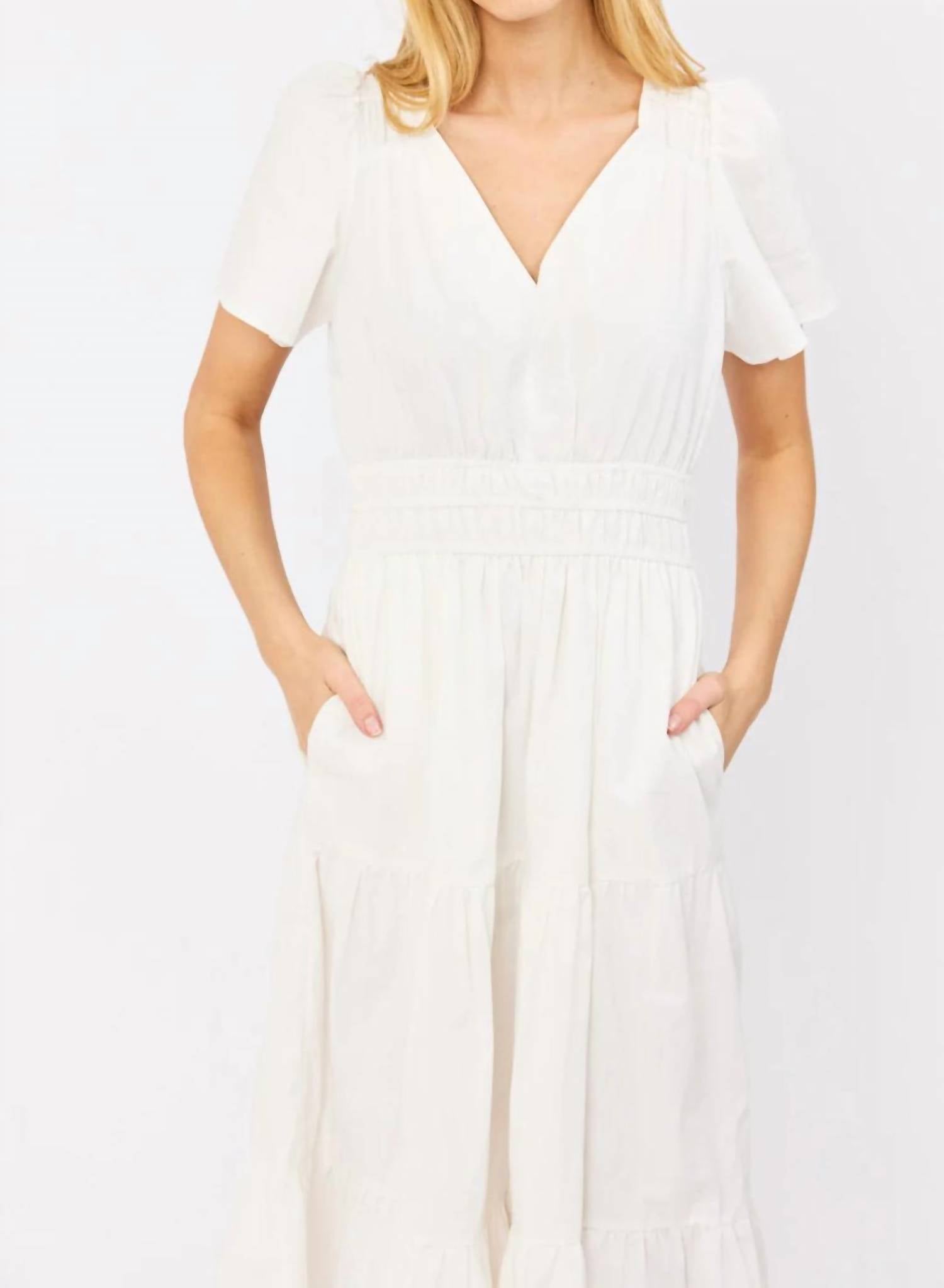 Who doesn't love a good maxi dress? This one you'll be reaching for season after season. The Annabelle Maxi Dress by Marea is a perfect blend of style and elegance, suitable for any vacation or summer outing. Designed in solid white with a feminine V-neck and cap sleeves, this A-line silhouette dress ensures a flattering fit, enhanced by its elastic waist. Made from comfortable cotton, it features practical pockets to keep essentials close at hand. Care for this minimalist piece by opting for dry cleaning to maintain its pristine condition.
