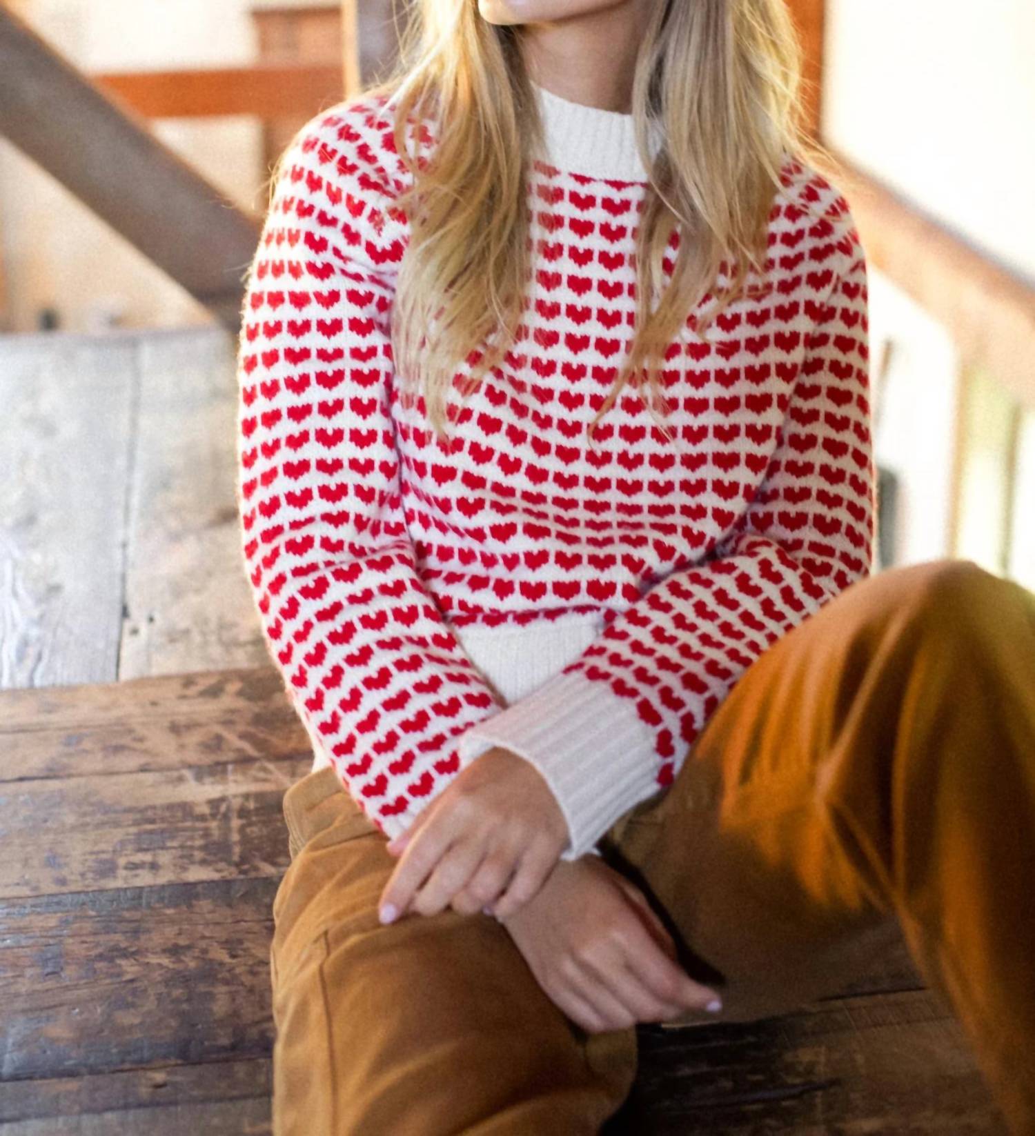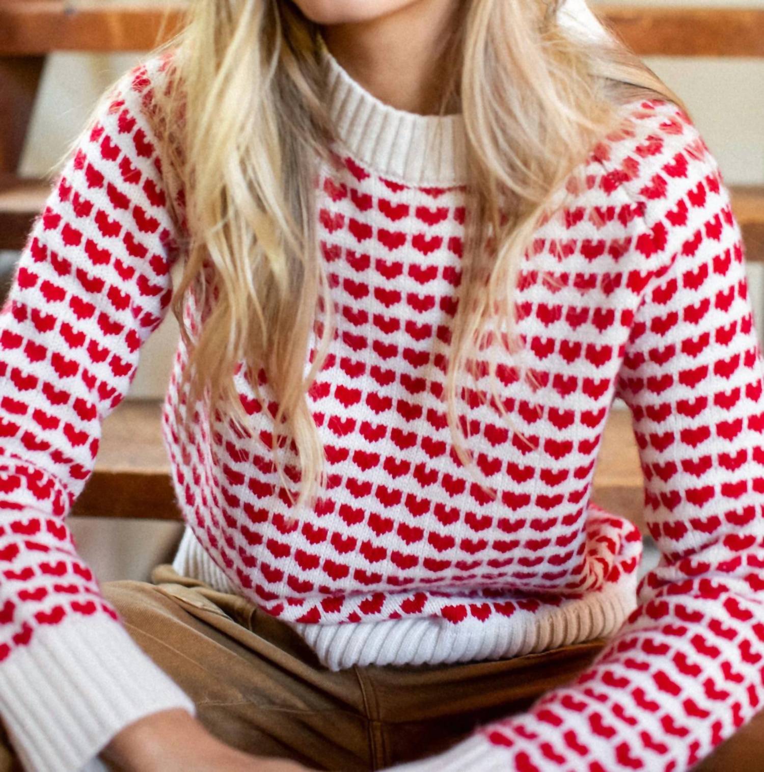 Experience the perfect blend of comfort and style with this trendy crew neck sweater, designed to effortlessly elevate your wardrobe. Pair it with your favorite denim and loafers for the perfect look. A cozy classic with a playful twist. The Heart Sweater blends timeless knitwear with a charming Valentine’s-inspired motif for a look that feels both festive and forever wearable. Women’s crewneck sweater with full-length sleeves Straight body shape that sits at the high hip for a flattering fit Allover mini heart intarsia in classic red on an ivory ground Finished with 2x2 rib trim at neckline, sleeve cuffs, and hem Warm yet lightweight knit designed for everyday wear A feel-good sweater perfect for layering through winter and beyond