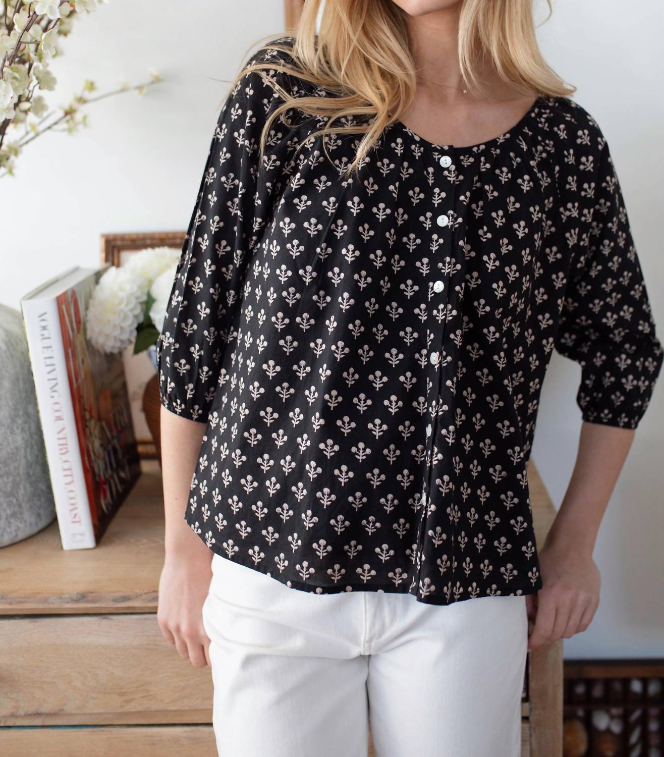 Pair this with your favorite jeans and slides for your next girls night out. Discover the sophisticated Sophie Button Down Top by Marea, adorned in the striking Black Marea Flower print. This women's blouse, with its three-quarter sleeves and button closure, boasts a feminine yet slightly boxy shape that flatters all body types. Thoughtfully detailed with elasticized cuffs and a classic boatneck, it features a versatile and elegant design perfect for any occasion. Made for convenience, this blouse is machine washable and can be tumble dried.