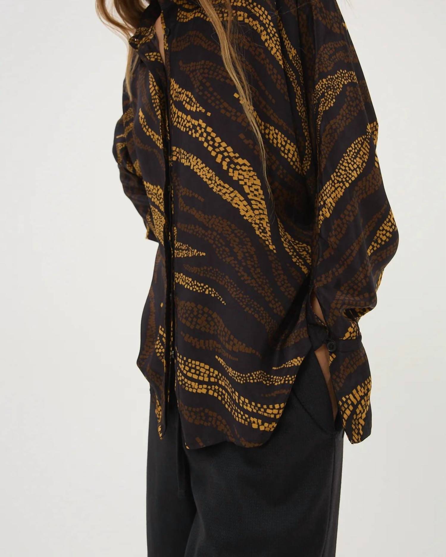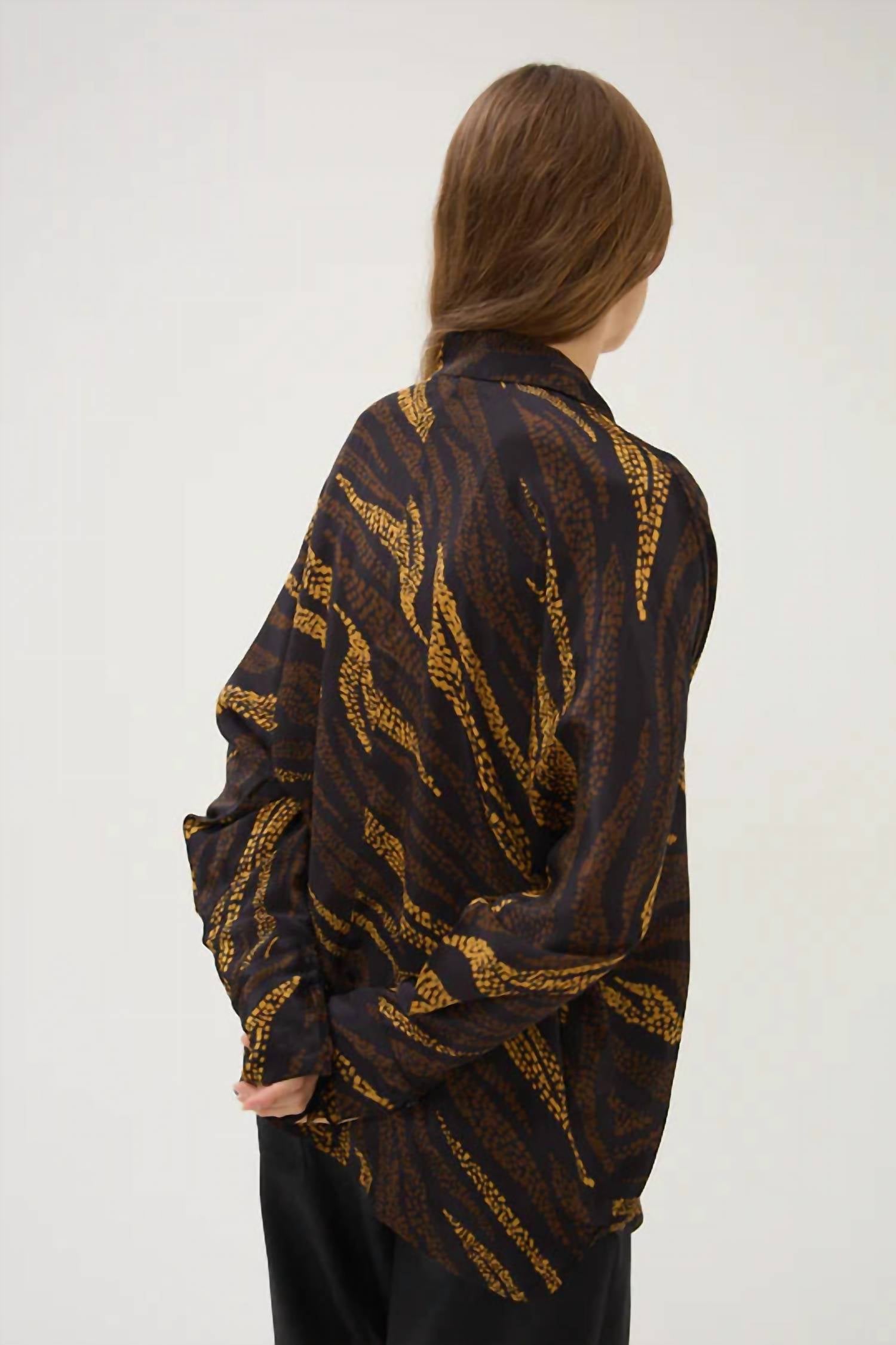 A versatile blouse that works from desk to dinner! Experience the Clary Shirt by Maria Cher, a chic addition to your vacation wardrobe with its captivating animal pattern in rich brown. This long sleeve blouse is expertly crafted from viscose, offering both comfort and elegance. The shirt features a classic collar and is secured with a button closure, making it versatile for various occasions. Easy to care for, simply hand wash and lay flat to dry to maintain its quality.