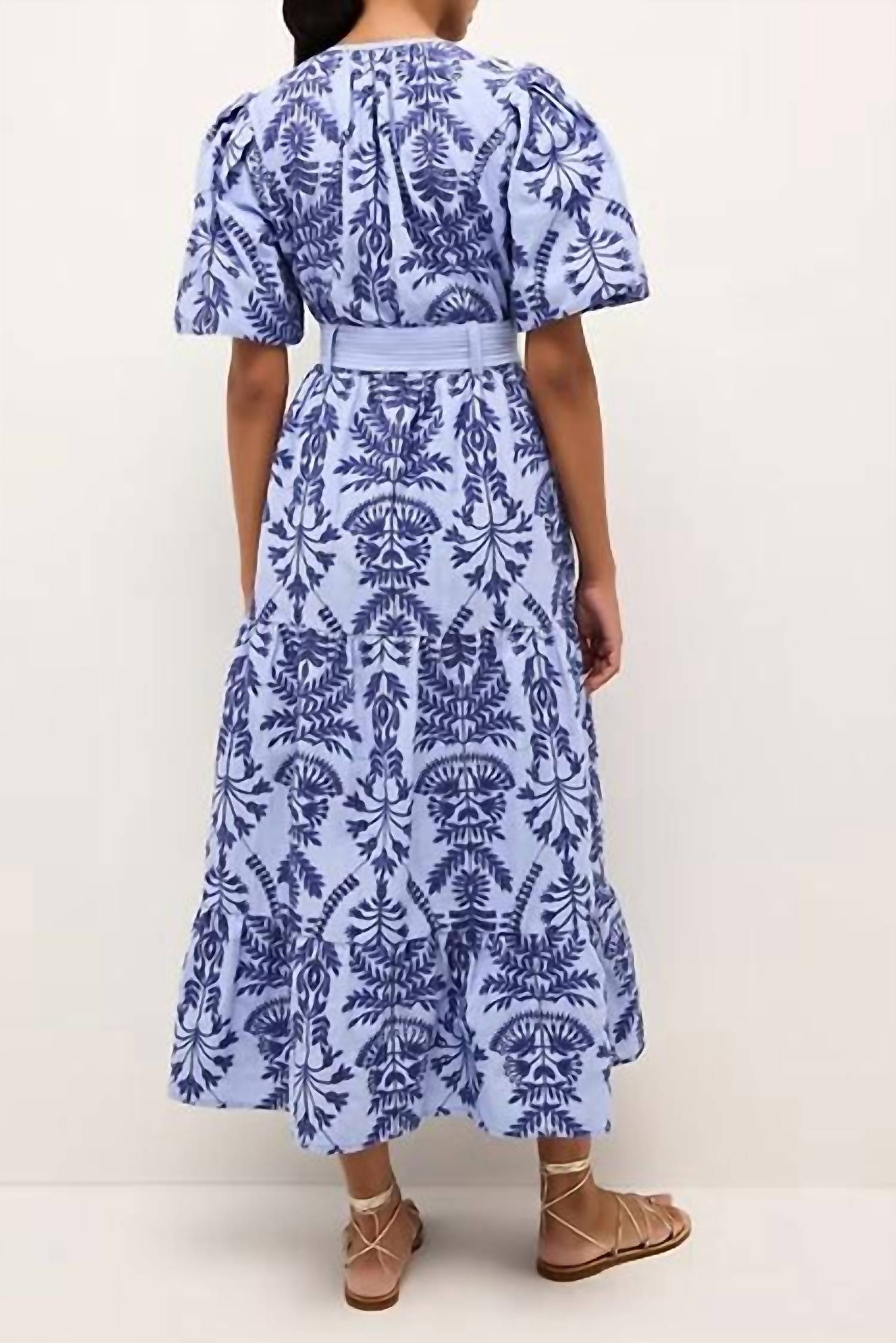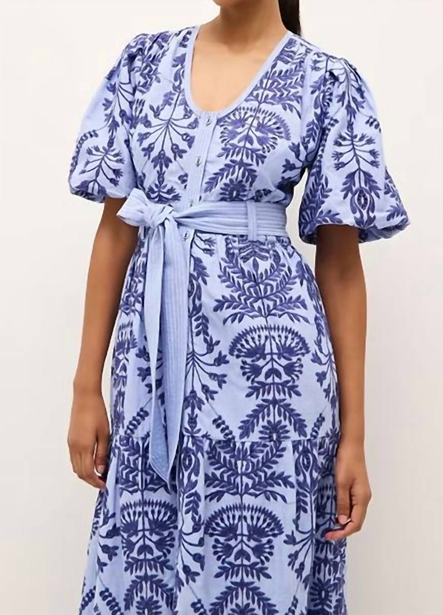 Just add slides or mules and you are good to go. Introducing the Natty Dress by Marie Oliver, a captivating piece in serenity hue adorned with deep ocean blue floral embroidery. This midi dress boasts short sleeves with bagged detail and a flattering scoop neck, exuding elegance for spring occasions. Crafted from 100% cotton, it features a button closure and comes with an optional tie belt showcasing trapunto stitch detail. For longevity, it is recommended to dry clean only.