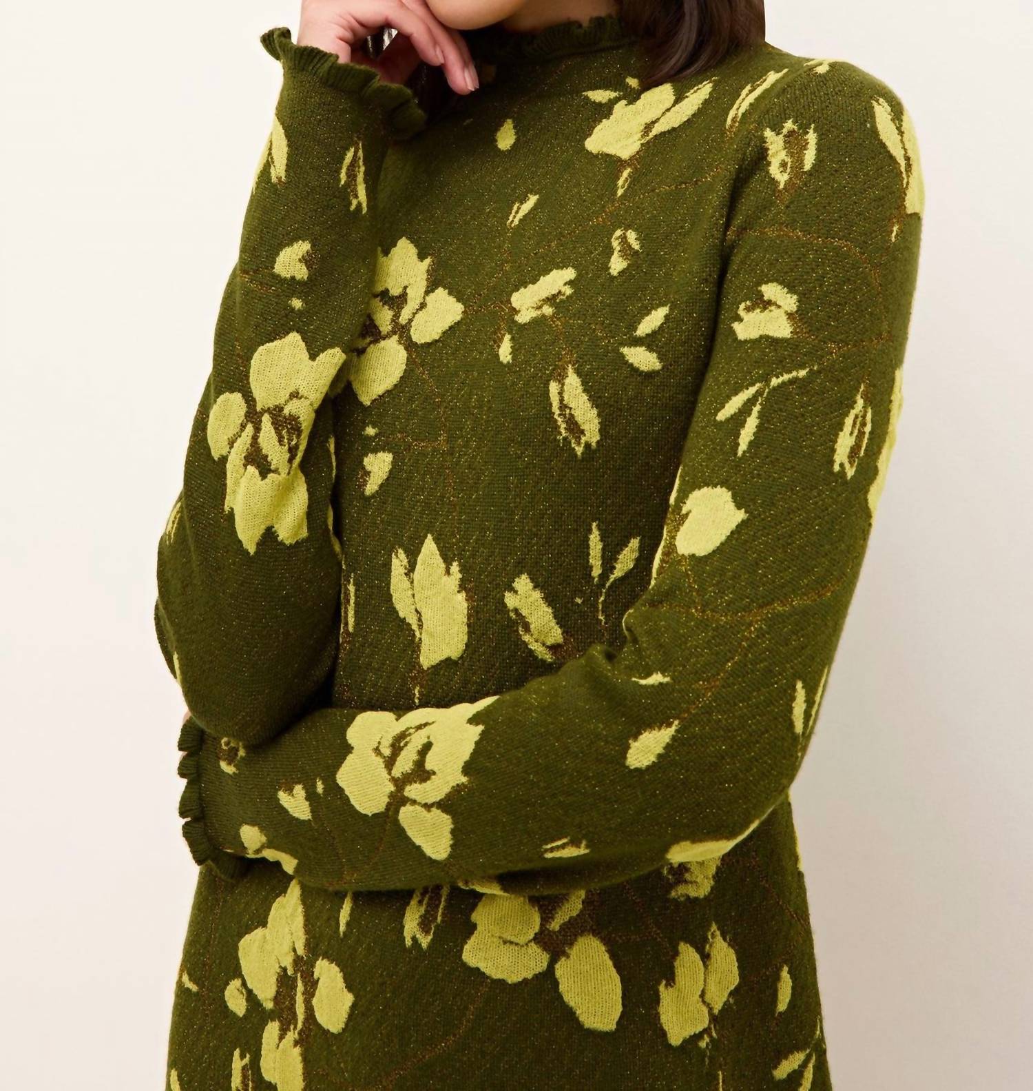 Cute and comfortable, this long sleeve dress has it all. Meet the Oaklynn Dress by Marie Oliver, a figure-skimming silhouette perfect for any occasion. Long sleeves with ruffle trim details complement the mock neck for a touch of elegance. Crafted from a luxurious blend of 70% wool, 15% polyester, 10% viscose, and 5% lurex, the unlined dress features a shimmering metallic grass green with a citron floral pattern. Closure: Pull on. Care: Dry clean or hand wash flat dry.