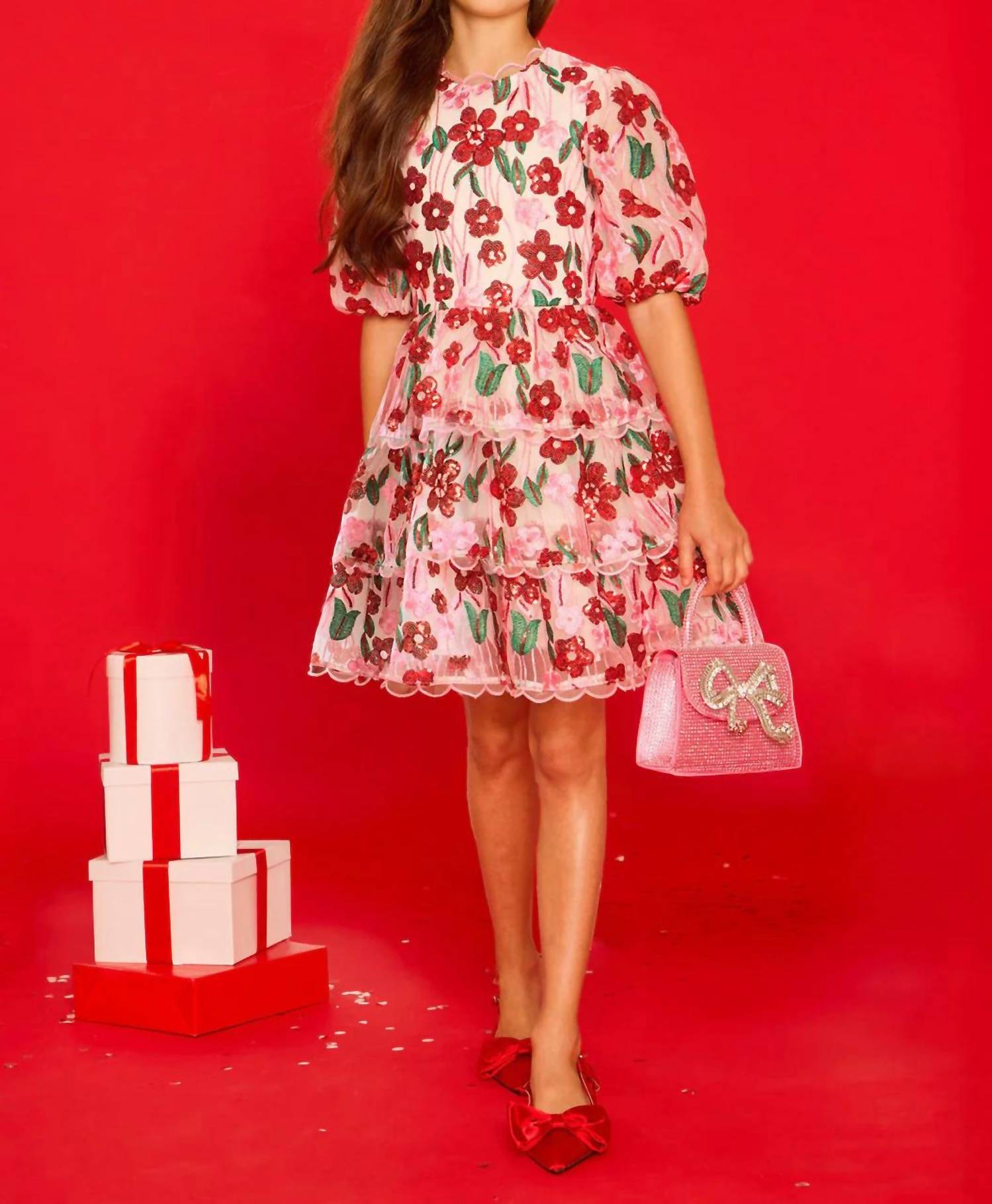 Transform her spring celebrations with the Shyla Embroidered Mini Dress by MARLO, a delightful blend of style and festivity. This girl's dress in charming pink and red flaunts puff sleeves with elasticated cuffs, a tiered frill skirt with a scalloped hem, and is adorned with intricate floral embroidery and shimmering sequins. Made from 100% polyester with a 100% cotton lining, it features an invisible back zipper and is fully lined for comfort and elegance. Perfect for church occasions, care is simple with dry cleaning recommended. Model wears size 9–10 yrs.