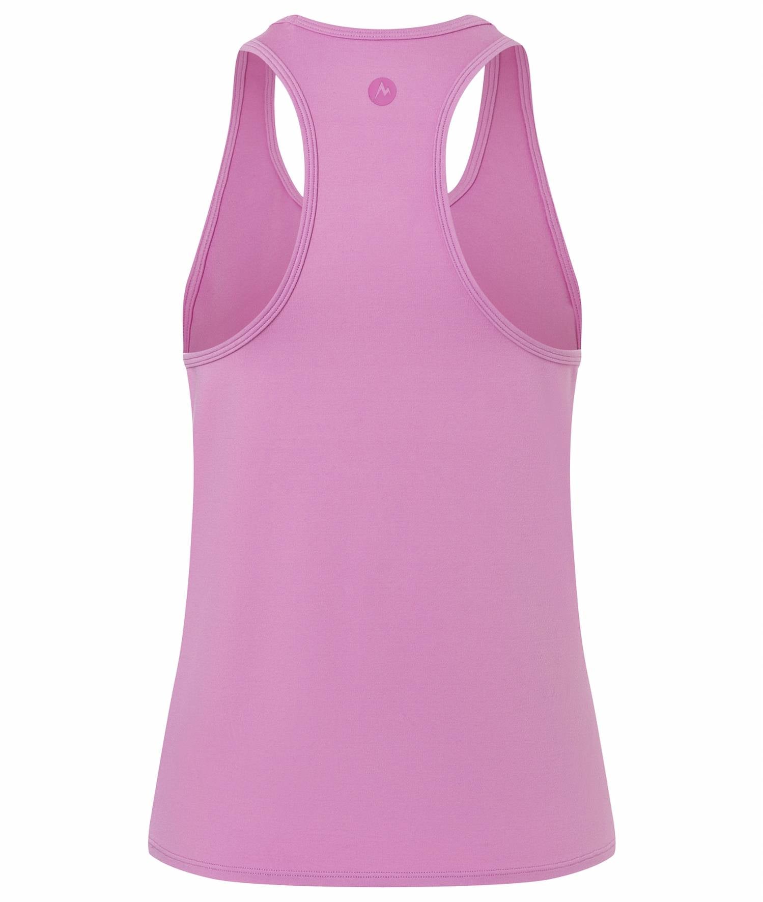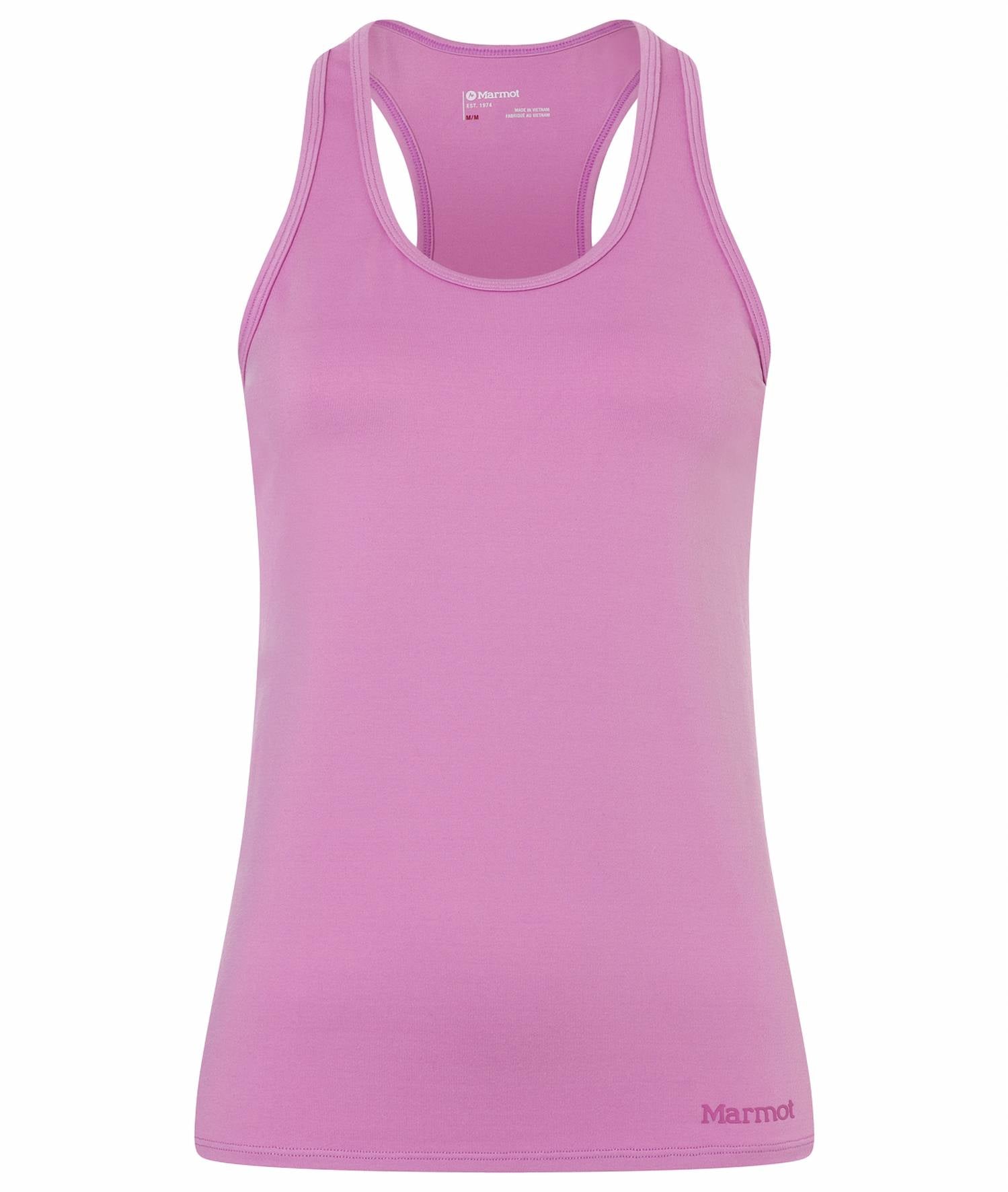 This classic tank top is perfect for layering and cute enough to wear on its own. Introducing the Women's Leda Racer Tank by Marmot, designed for the active woman who seeks functionality and style. This sleeveless tank is made from a medium-weight, high-performance knit comprised of 92% Polyester and 8% Elastane, ensuring moisture-wicking, stretchable comfort. With its racerback style and integrated SPF 50, it provides both a secure fit and sun protection, making it perfect for outdoor adventures or gym sessions. Closure: Pull on. Care instructions: Hand wash and tumble dry. This Wild Orchid athleisure piece weighs 122 g and features a scoopneck design, tailored for fitness enthusiasts.