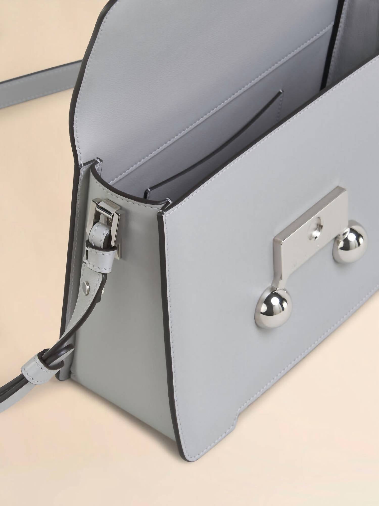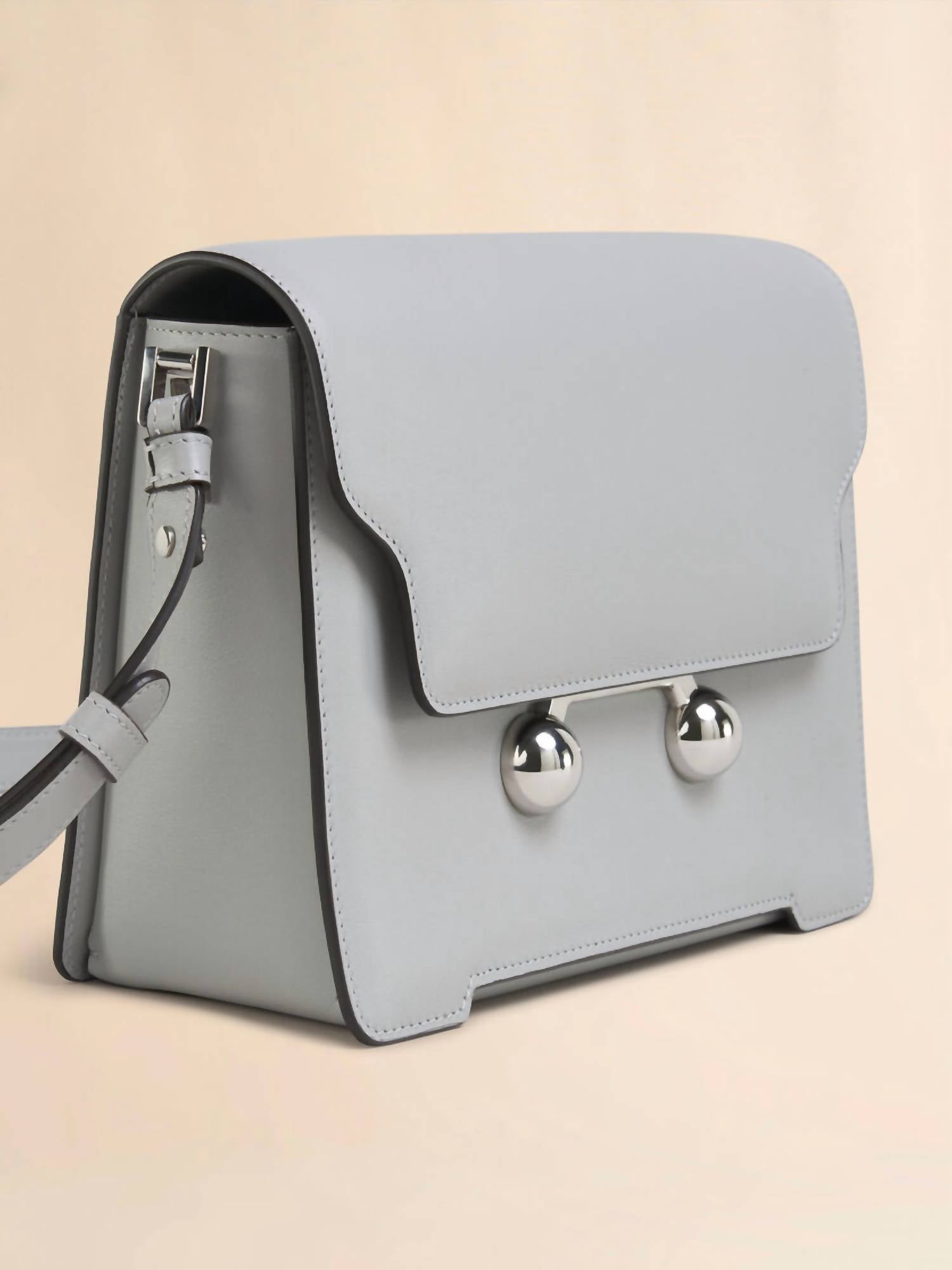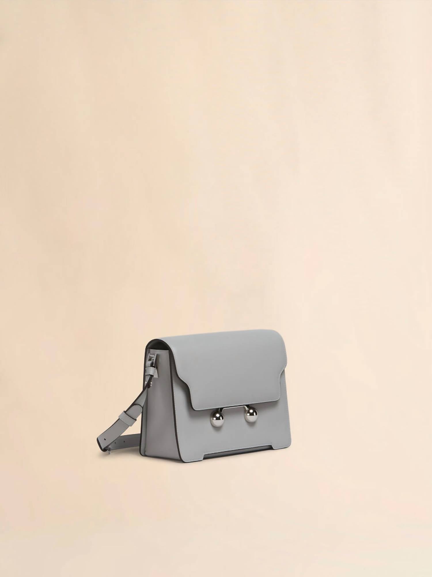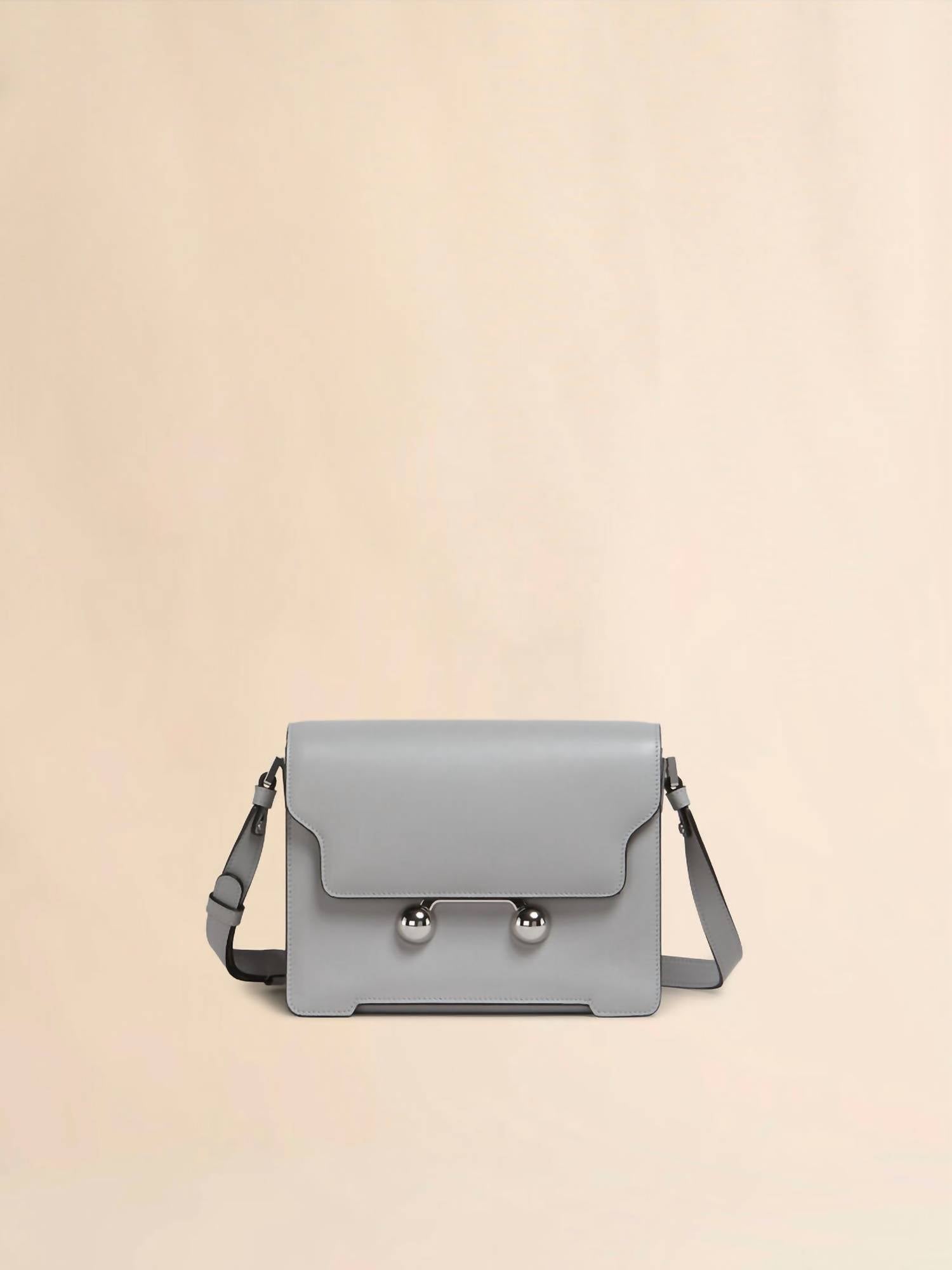 Meet the Medium Shoulder Bag by MARNI, expertly crafted from luxurious calfskin leather in a sophisticated storm hue. This Italian-made bag boasts a front flap with magnetic closure, complete with engraved Marni lettering and oversized stud details, adding a touch of bold elegance. The removable and adjustable buckled shoulder strap offers versatility to wear as a shoulder bag or a clutch. Made using leather from a Leather Working Group medalled tannery, it emphasizes sustainability alongside timeless style.