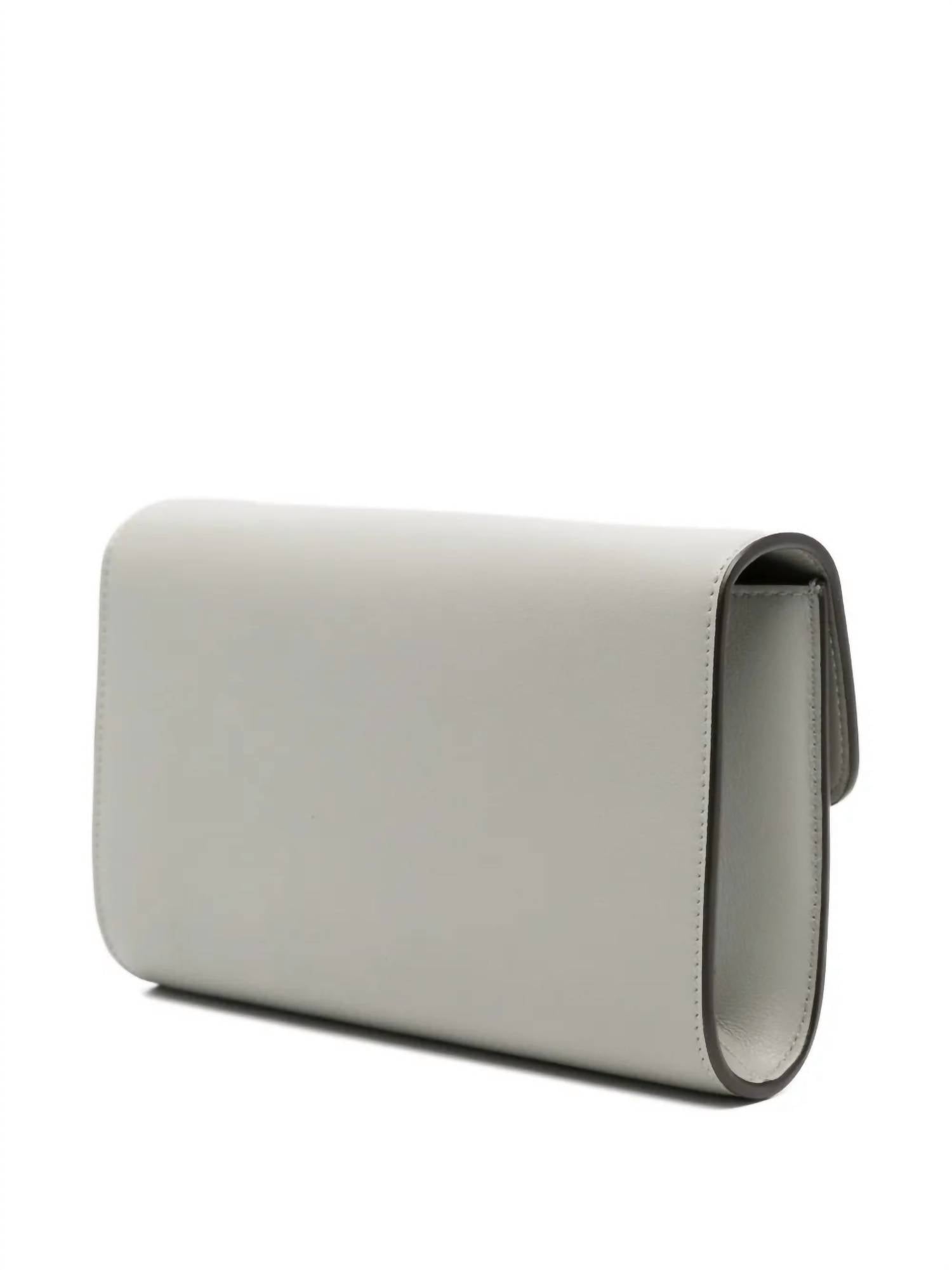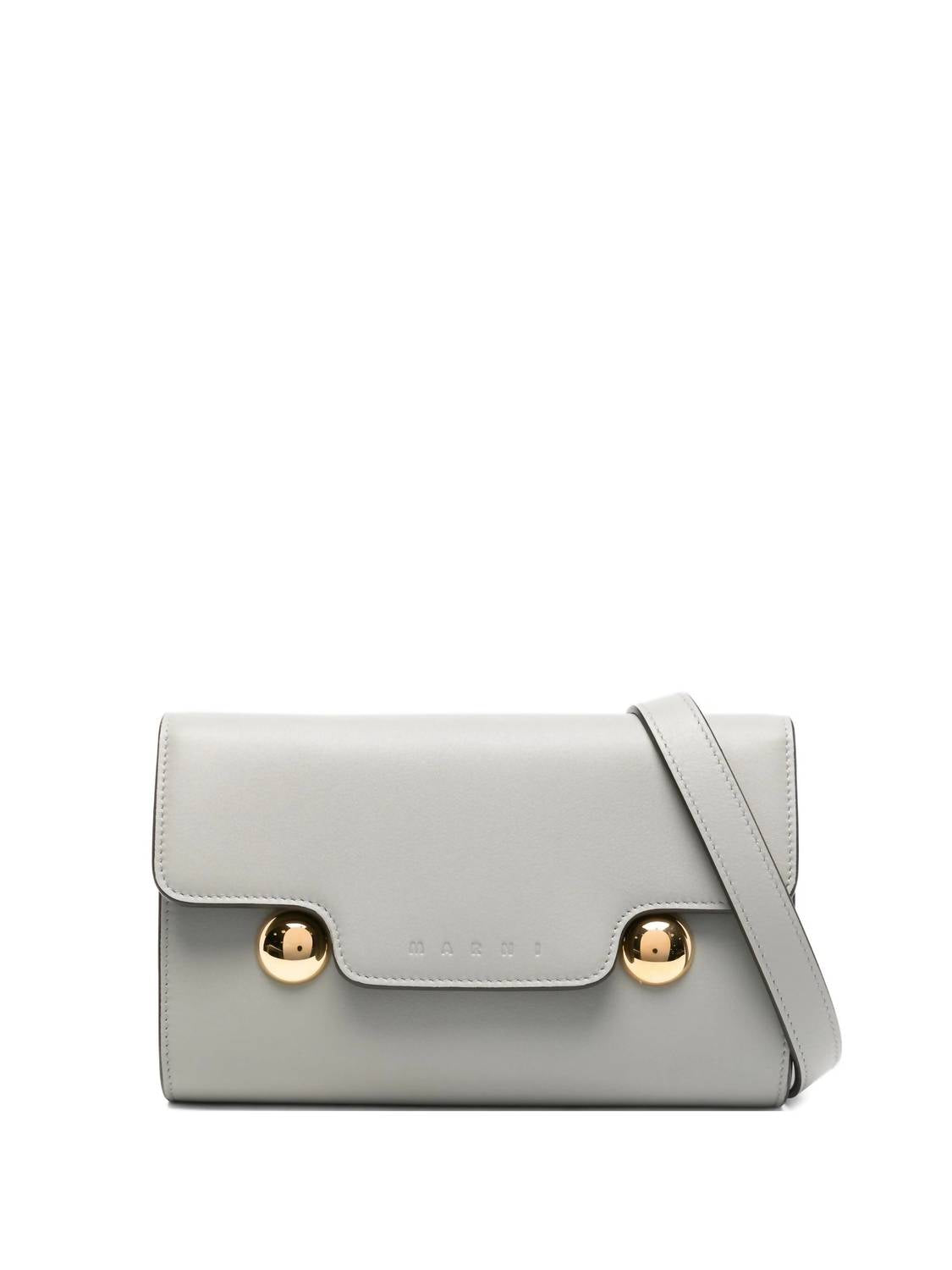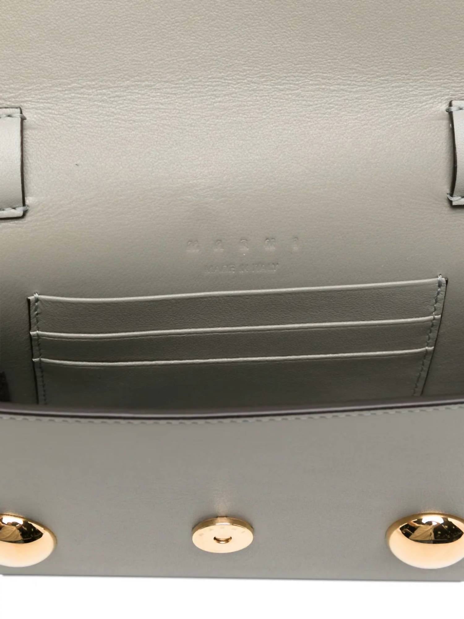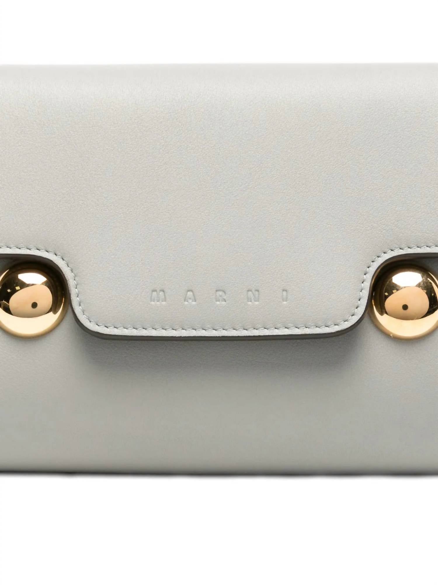 The perfect clutch for an evening out on the town. Elevate your accessory game with the Women's Trunkaroo Clutch by MARNI in the sophisticated shade of storm. Crafted from smooth calf leather, this compact clutch features a removable and adjustable sliding strap for versatile wear. The sculpted front flap stands out with two distinctive metal stud details, complemented by luxurious nappa leather lining and two internal card slots. Made in Italy with gold hardware, this piece is crafted from leather sourced from a Leather Working Group medalled tannery, ensuring responsible manufacturing standards.