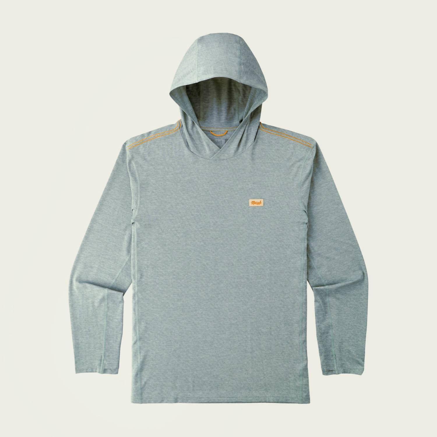 Introducing the High Noon Tech Hoodie by Marsh WEAR, an advanced option in solid Angel Falls Heather for men seeking sun protection and all-day performance. This long sleeve hoodie is crafted from a blend of 46% Seawool recycled polyester, 46% polyester, and 8% spandex, offering a breathable, quick-drying, and moisture-wicking fabric with UPF 40. The pull-on closure and thumb holes enhance practicality, making it an ideal companion for vacation or athleisure wear. Care: Machine wash.