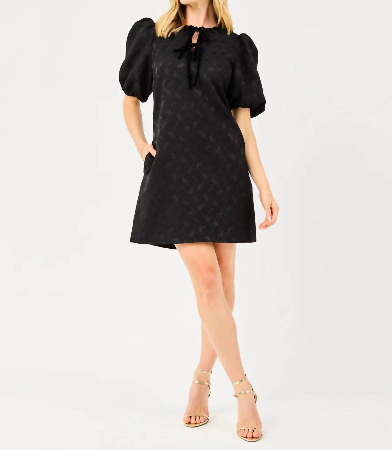 The perfect mini dress for those warmer months. The Lana Mini Dress by Mary Square is an enchanting piece crafted from luxurious brocade polyester, perfect for making a statement at your next special occasion. This black patterned dress features short puff sleeves with elastic cuffs and delightful velvet tie details, offering both texture and charm in a flattering straight fit. Closure: Tie closure. Care: Machine wash cold, gentle with like colors, do not bleach, hang to dry. Available in sizes XS (33"-35" bust, 34.5" length) to XL (43"-45" bust, 36.5" length). Model is 5'6" and wearing size S.