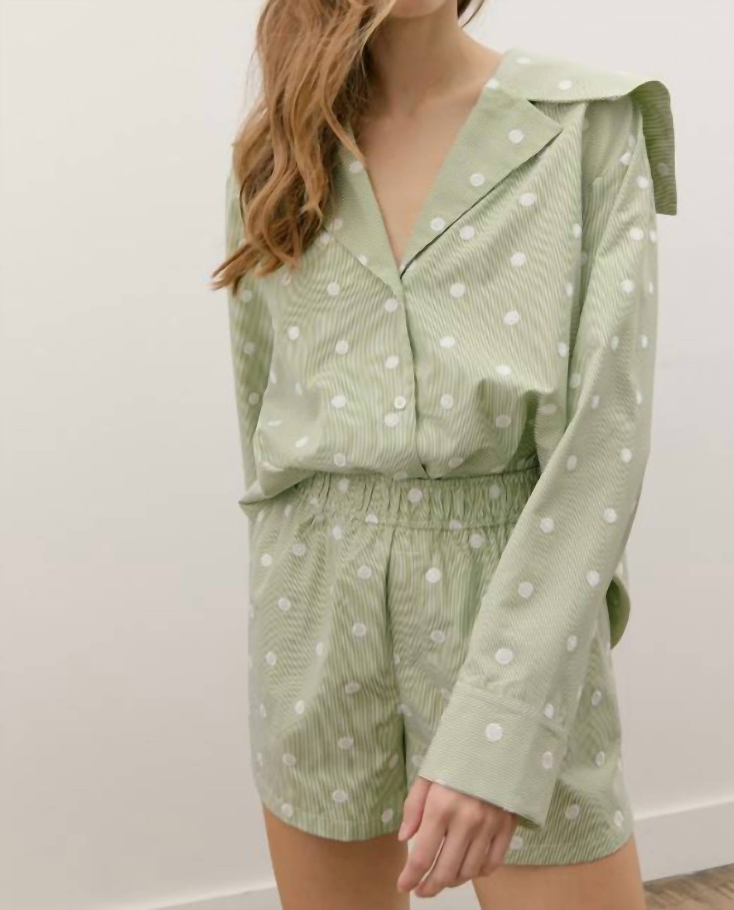 The perfect long sleeve tee that goes with just about anything. Embrace boho chic with the Flynn Striped Polka Dot Top by Maude, a perfect addition for your Easter vacation wardrobe. This long sleeve, cotton blend tee in a striking green features a playful polka dot pattern and a trendy collar neckline. Composed of 50% cotton and 50% polyester, it's designed for comfort and style. Easy to care for, simply machine wash and lay flat to dry.