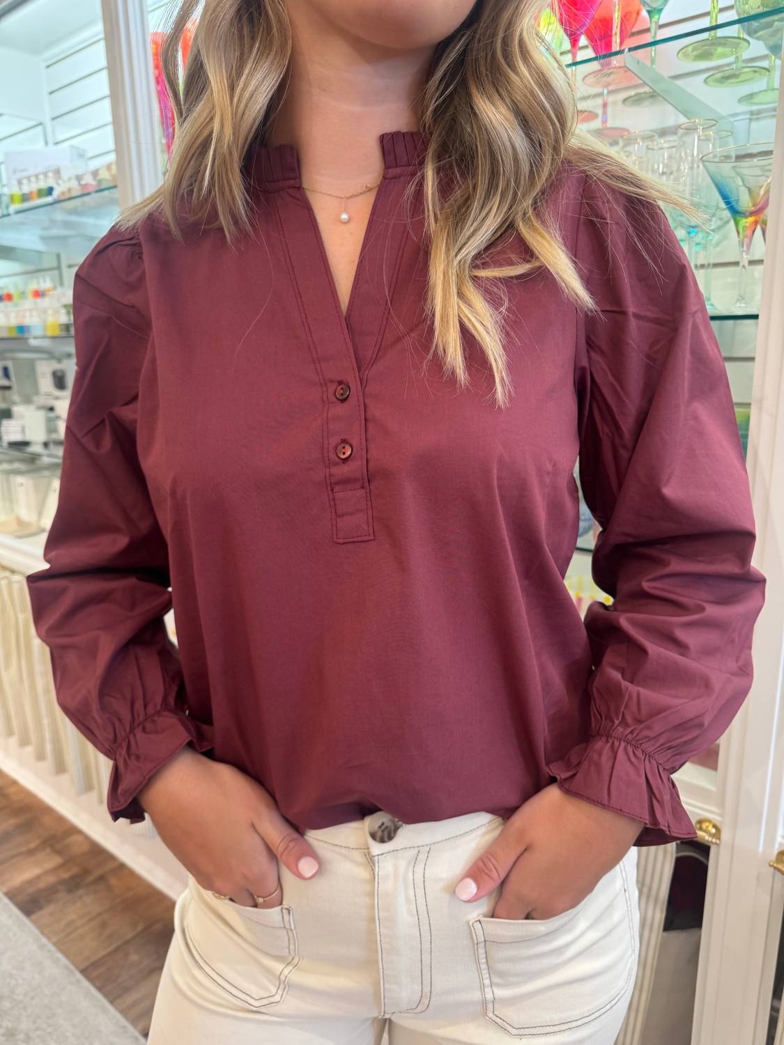 Pair this with your favorite jeans and slides for your next girls night out. Introducing the Rory Top by Maude Vivante, a sophisticated addition to your wardrobe in a rich wine hue. This women's blouse features long sleeves and a flattering V-neck, perfect for holiday parties or elegant occasions. Closure: Button closure. Crafted without pockets for a streamlined silhouette.