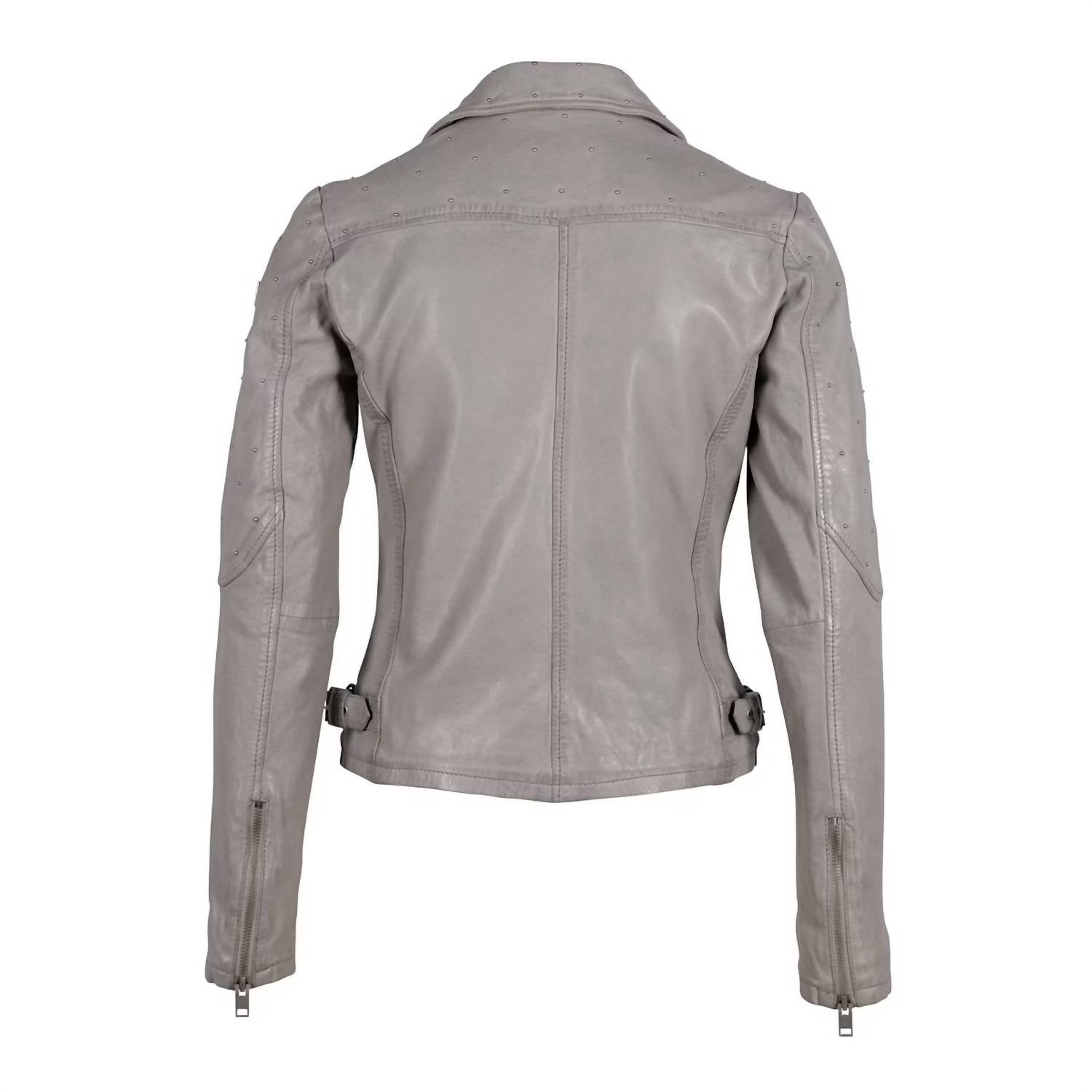 Everyone needs a leather jacket like this in their closet. Elevate your style with the Women's Aleeza RF Leather Jacket by MAURITIUS, a sophisticated choice in a light grey hue. This long-sleeve jacket is crafted from genuine lambskin leather, ensuring a supple and comfortable fit, complete with stud detailing for added flair. Designed in a classic moto style, it features a zip closure and convenient pockets, making it a staple for streetwear and concert outings. Care for this timeless piece with dry cleaning to maintain its quality for years to come.