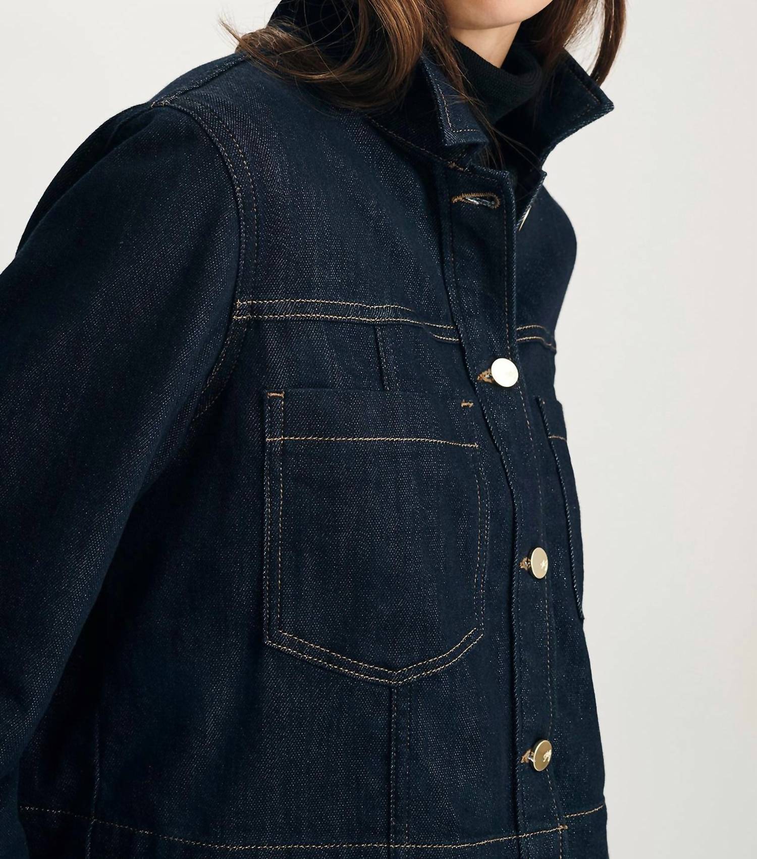 Throw this adorable jacket over just about anything for an effortlessly stylish look. Presenting the Tanya Denim Jacket by Mavi, a chic piece in a dark blue wash with a subtle shimmer. Designed with long sleeves and a cropped, slightly oversized fit, this jacket features structured chest pockets for added functionality. The composition of 66% cotton, 20% recycled cotton, 13% polyester, and 1% elastane ensures soft, stretchable wear. Closure: Button closure. Care: Machine wash and tumble dry. This versatile jacket is perfect for travel and streetwear, with a touch of luxury from gold-toned buttons.