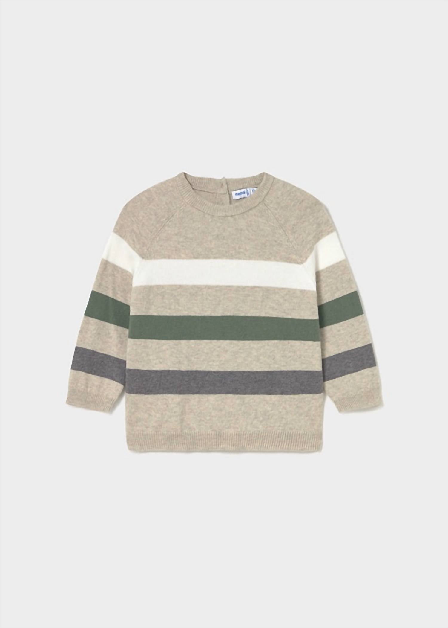 Keep your little one cozy in the Mayoral Boy's Block Stripe Sweater, a stylish choice for holiday gatherings. This long-sleeved sweater features a crewneck with a convenient back button closure and comes in a charming chai color adorned with a striped pattern. Composed of 60% cotton, 30% polyamide, and 10% wool, it seamlessly combines comfort with a touch of recycled polyamide. Care is simple with machine wash cold instructions and a preference for laying flat to dry and cool ironing. Ideal for the Thanksgiving season, this vintage-inspired piece is perfect for fall occasions.