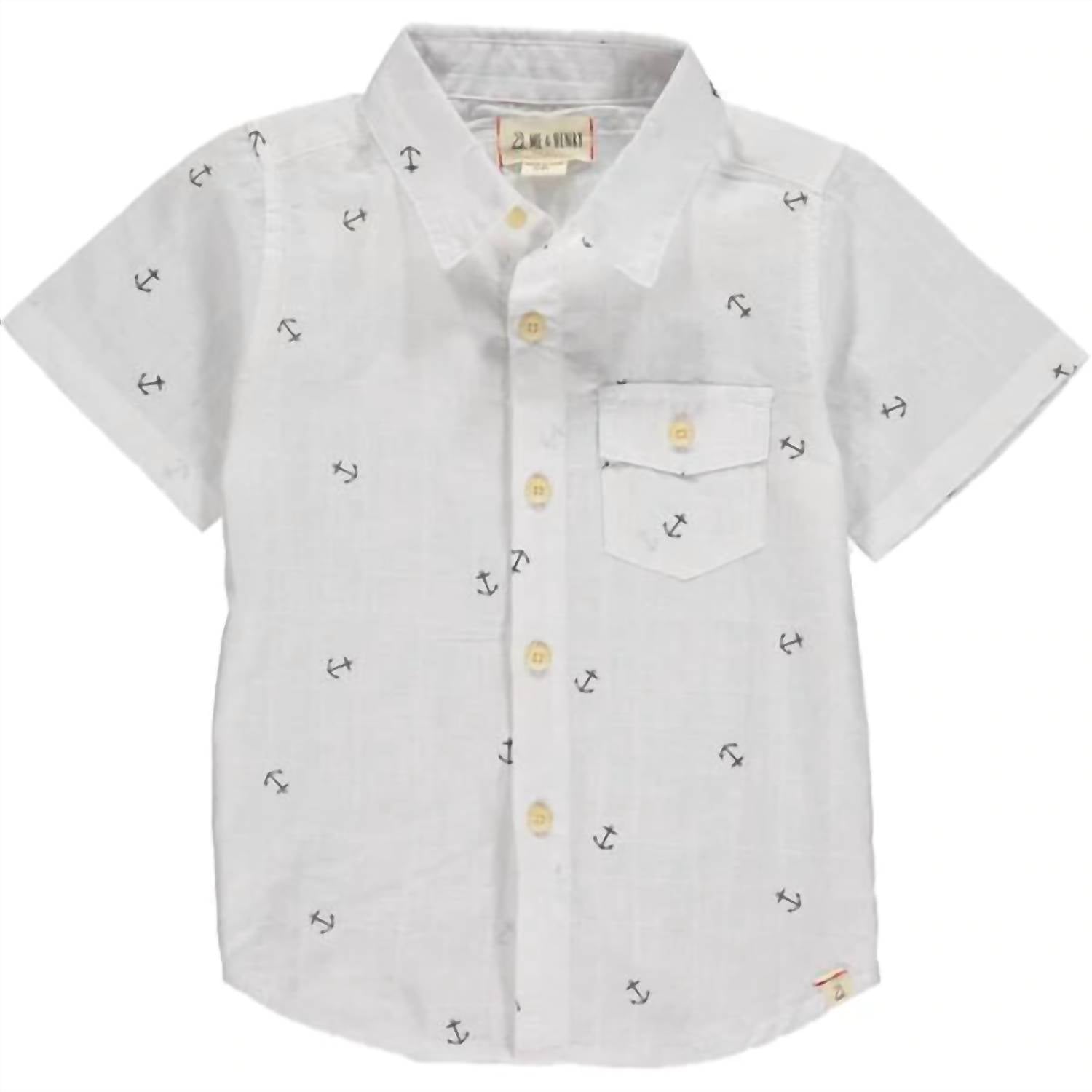 Introducing the Short Sleeve Button Down Shirt by ME & HENRY, tailored for boys with a playful white anchor print. Crafted from 100% cotton, this shirt brings a touch of maximalist style to summer vacations. Closure: Button down. Care: Machine wash, tumble dry.