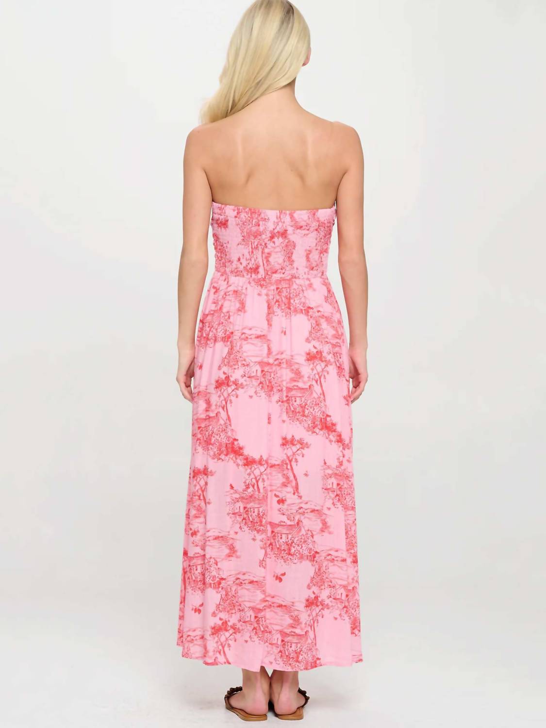 Style this maxi with your favorite statement necklace and sandals for the perfect look. Meet Me in Santorini presents the Sunset Cottage Tube Maxi Dress, an ode to effortless summer elegance. This strapless maxi dress features a comfortable ruched bodice and a flowing skirt, all crafted from lightweight rayon. Designed in a pink and red toile-inspired scenic print, it offers hidden side pockets for practicality. Closure: Pull-on. This patterned A-line dress is perfect for holiday parties and ideal for beach strolls or evening dinners.
