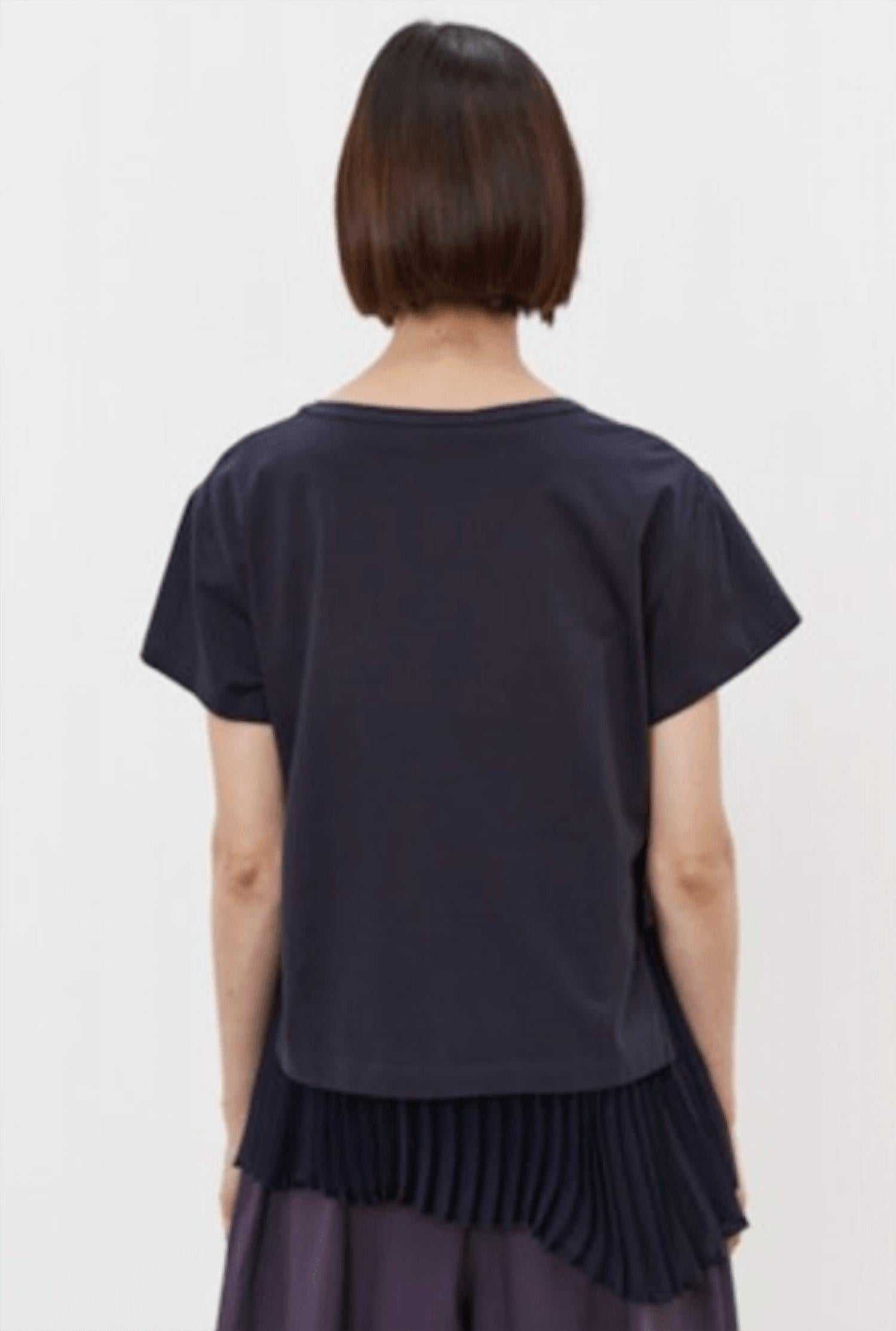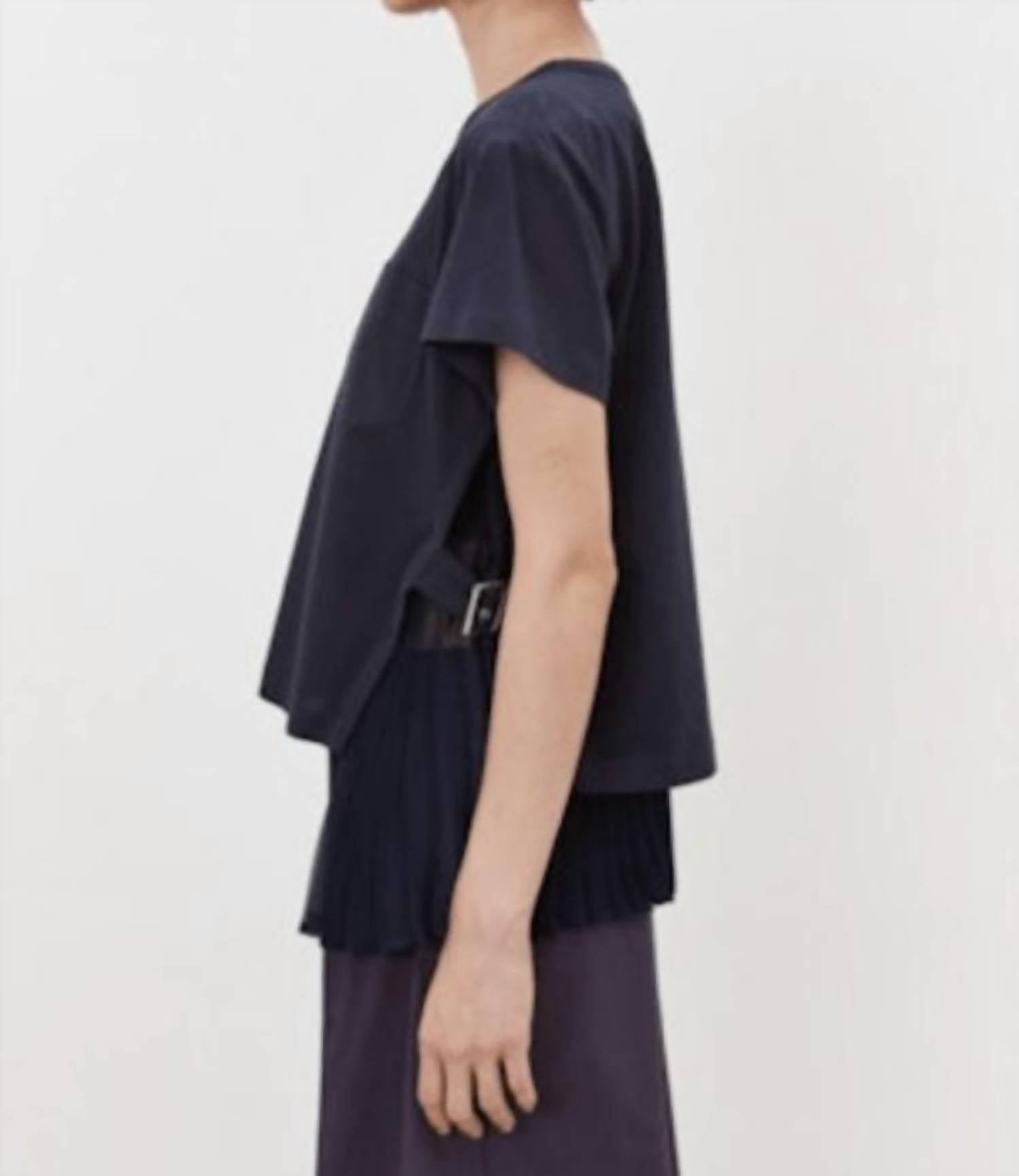 This classic, short sleeve tee will be your go-to staple this season and beyond. Introducing the Layered Blouse With Side Buckles by MEIMEIJ, a unique piece perfect for elevating your dinner party ensemble. This navy, short-sleeve t-shirt features a delicate pleated under-layer and chic buckled details on the sides. Made from 100% cotton, it offers a soft and comfortable fit. Closure: Pull-on. Ideal for spring occasions with a nod to 90s fashion.