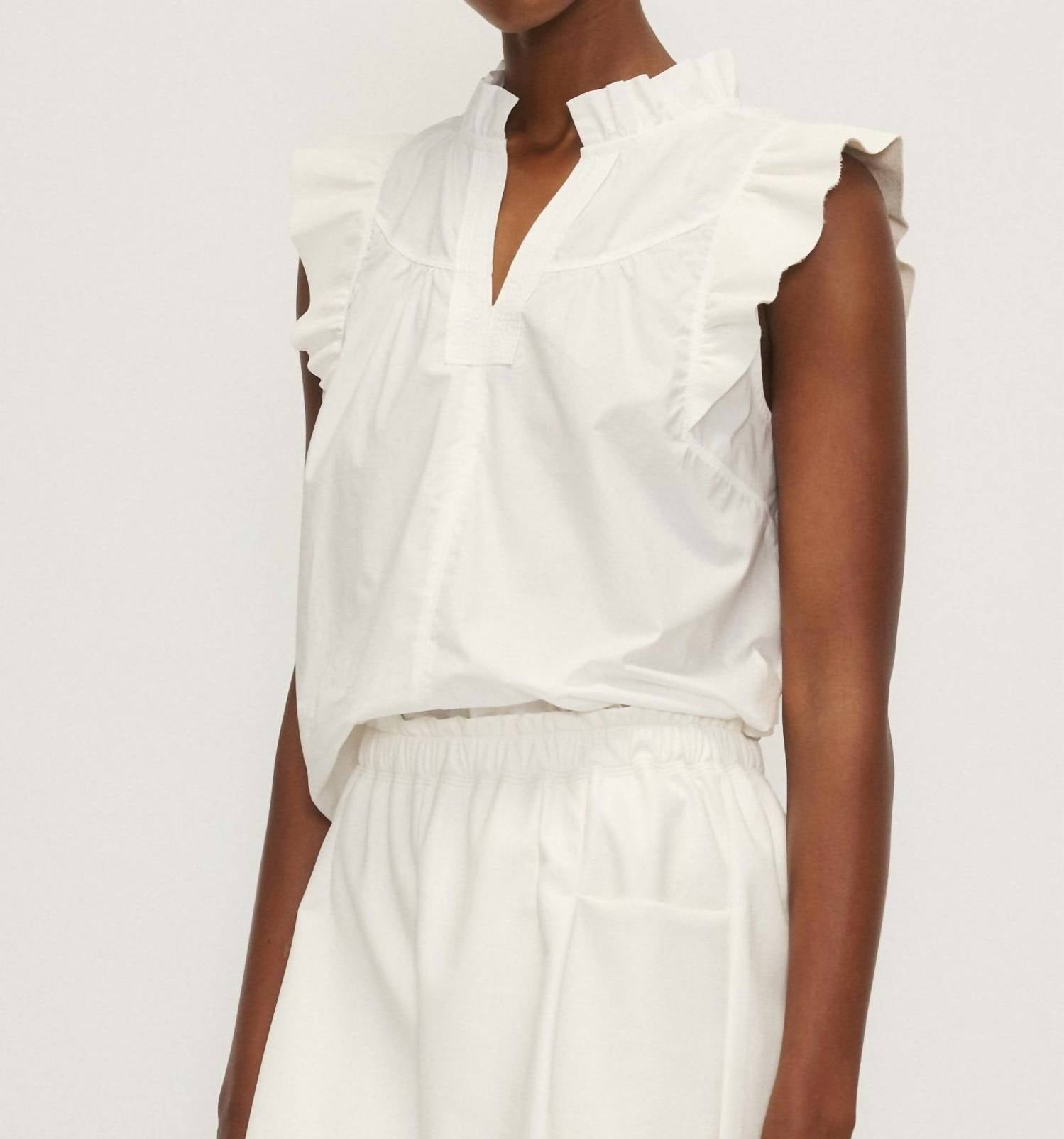 Pair this with your favorite jeans and slides for your next girls night out. Introducing the Liana Ruffle Blouse by MELISSA NEPTON, a sophisticated choice for any occasion. This sleeveless blouse in Off White features a V-neckline and vegan leather ruffle detailing for a touch of elegance. Made with a cotton blend of 85% Cotton and 15% Polyurethane, it offers both comfort and style. With a pull-on design, this blouse is easy to wear, and simple care instructions suggest hand washing and laying flat to dry, ensuring its longevity.