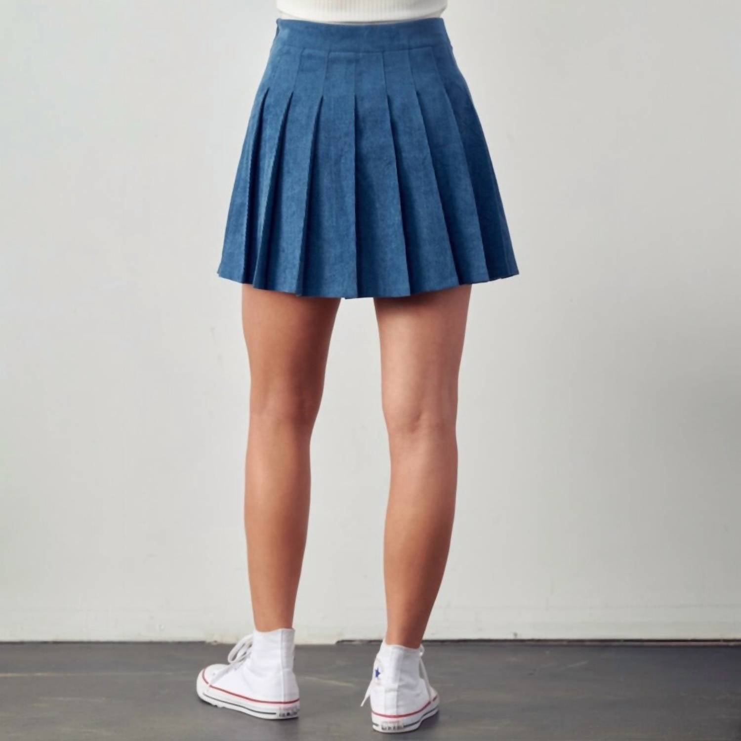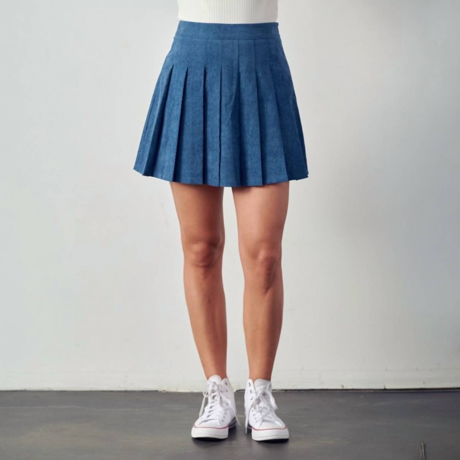 Show just the right amount of leg in this fit flattering mini. Elevate your game day style with the Corduroy Tennis Skort by &merci, designed for women who love athleisure. This blue mini skort features a comfortable pull-on closure and is crafted with built-in shorts for extra coverage. The hidden side zipper and pleated details add a touch of sophistication to this solid pattern piece. Care instructions include machine wash and tumble dry for easy maintenance.