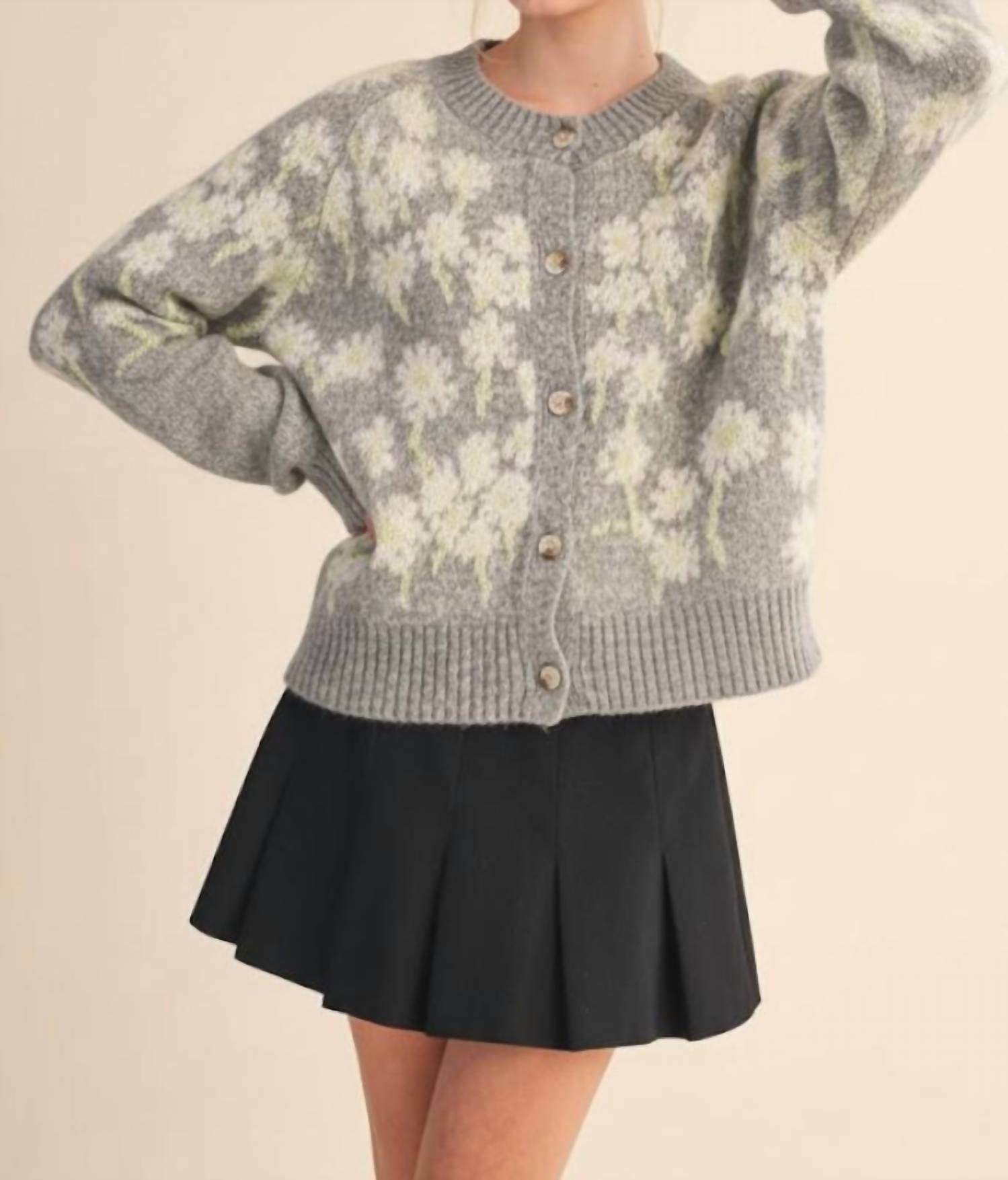 This cardigan will be a sweater-rotation favorite. Embrace effortless Boho Chic with the Floral Knit Cardigan by &merci, a must-have for your fall travel wardrobe. This grey cardigan features a charming floral pattern with long raglan seam sleeves and a button closure for easy layering. Designed with a crewneck, it offers a relaxed fit and waist-length cut, complemented by ribbed cuffs and hem. Care: Hand wash and lay flat to dry.