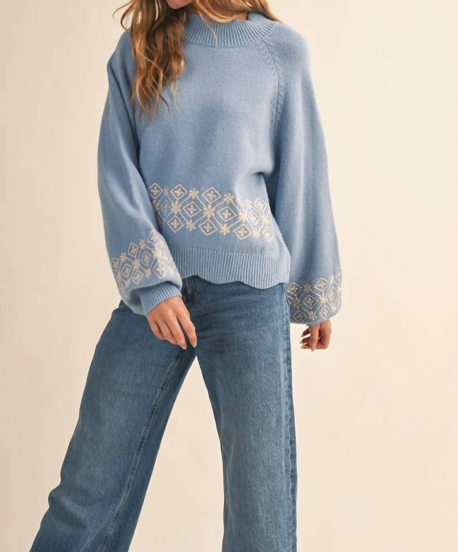 Experience the perfect blend of comfort and style with this trendy crew neck sweater, designed to effortlessly elevate your wardrobe. Pair it with your favorite denim and loafers for the perfect look. Introducing the Scalloped Mock Neck Sweater by &merci, a chic essential for your Fall wardrobe. With its elegant long puff sleeves and raglan seam, this sweater boasts a scalloped mock neckline and ribbed hem. It features intricate embroidery detailing on the front and sleeves, designed for a relaxed fit that pairs effortlessly with many outfits. Closure: Pull on. Care: Machine wash, lay flat to dry. Model is 5'10.5" and wears a size small (32" bust, 24" waist, 36" hip).