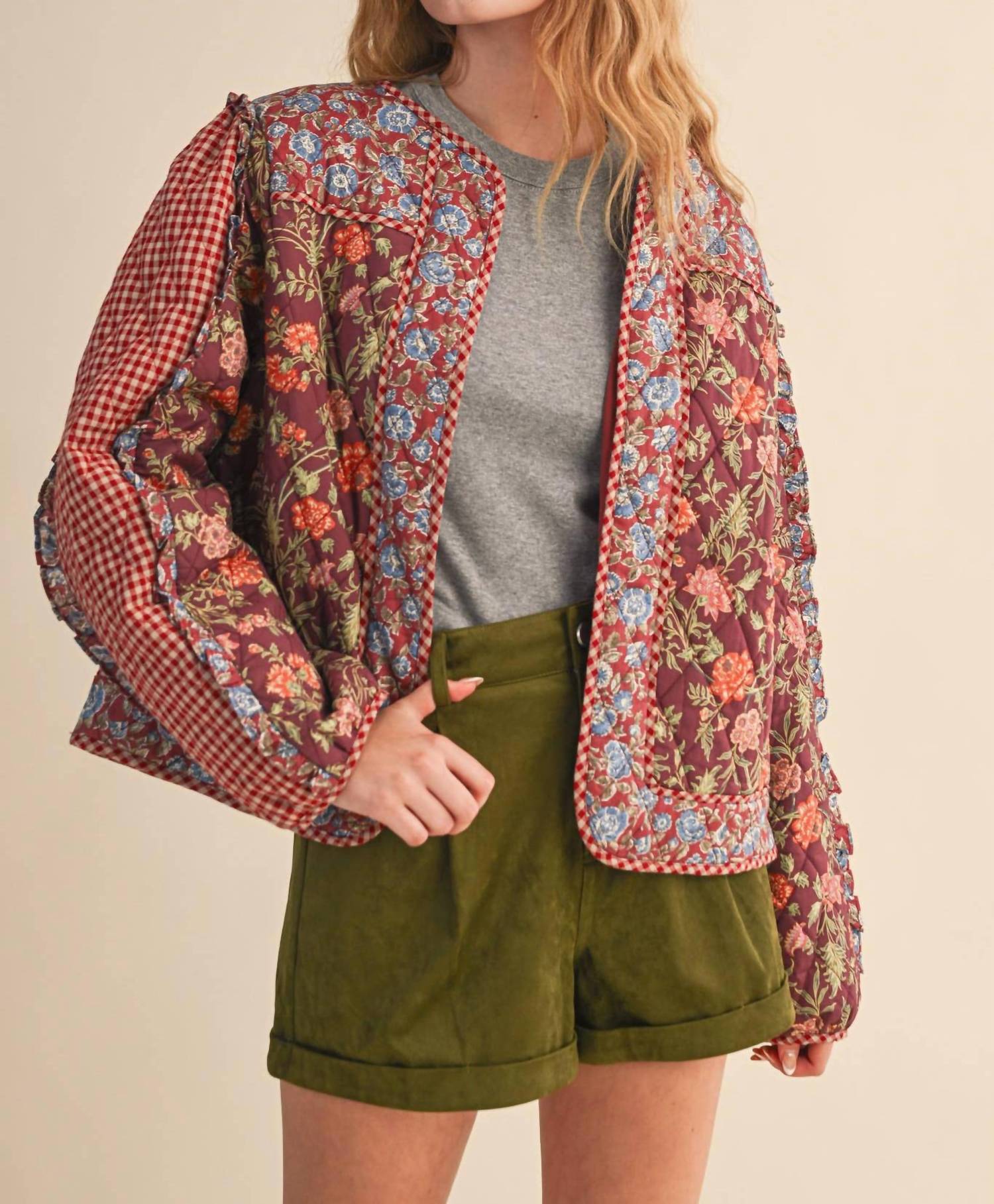 A jacket so versatile you can literally wear it with anything. Enhance your outerwear collection with the Women's Print Quilted Jacket by &merci, tailored in a vibrant burgundy hue. This Boho Chic jacket features long puff sleeves accentuated with ruffle accents and a playful floral pattern. The open front design offers effortless style, complemented by a round neckline and contrast gingham binding. Closure: Pull on. Lined for comfort and suitable for spring vacation layering. Modeled on a 5'10.5" frame wearing size S.