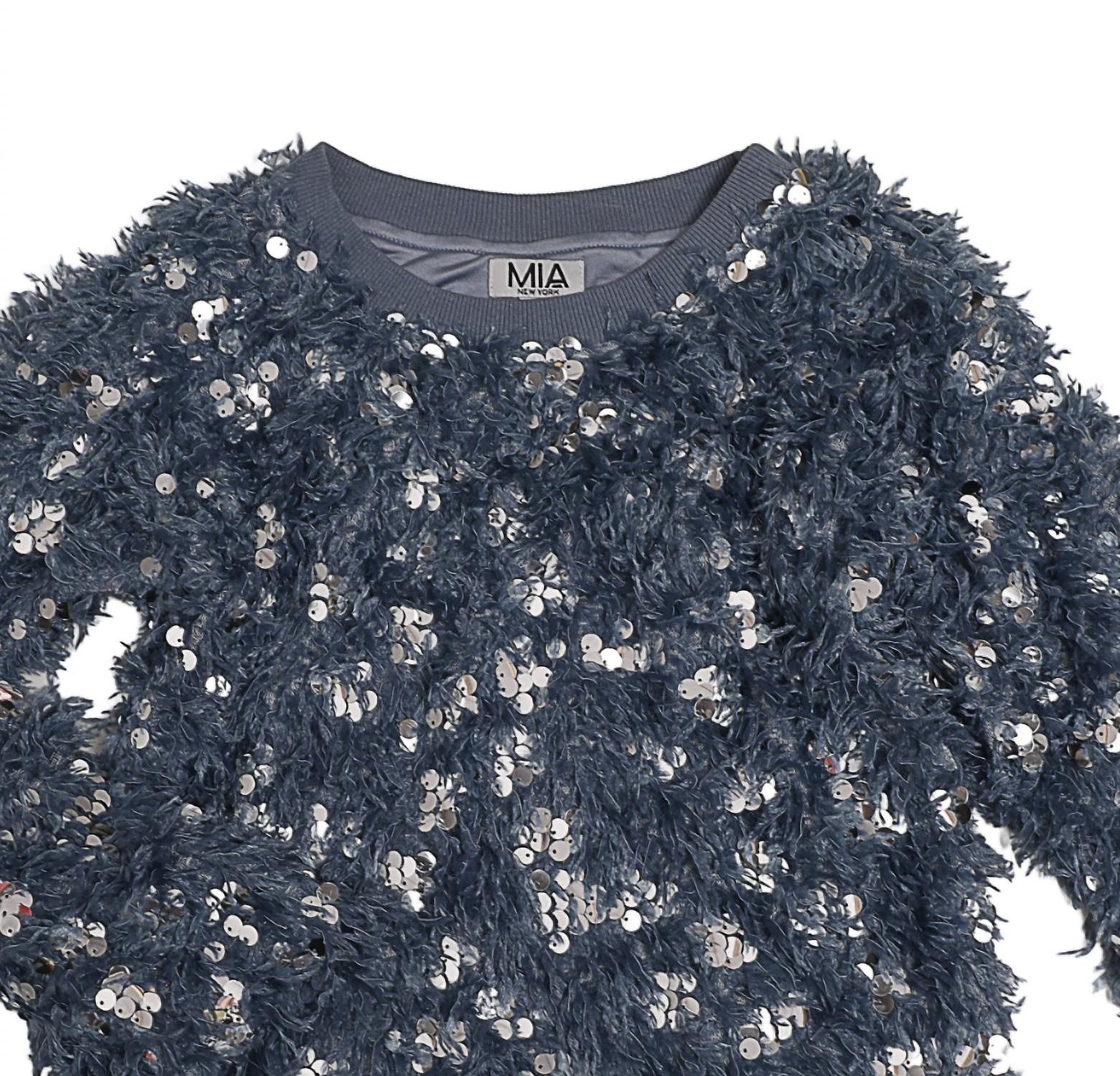 Shimmer in style with the Girls Texture Sequin Sweater by MIA, perfect for New Year's Eve and vacation occasions. This denim blue piece features a crewneck and full-length sleeves, crafted from a textured polyester material with silver sequin accents for a maximalist touch. Its pullover design ensures comfort, with a fully lined interior providing additional warmth. Care for this garment by turning it inside out, hand washing cold separately, and line drying to maintain its sparkling allure.