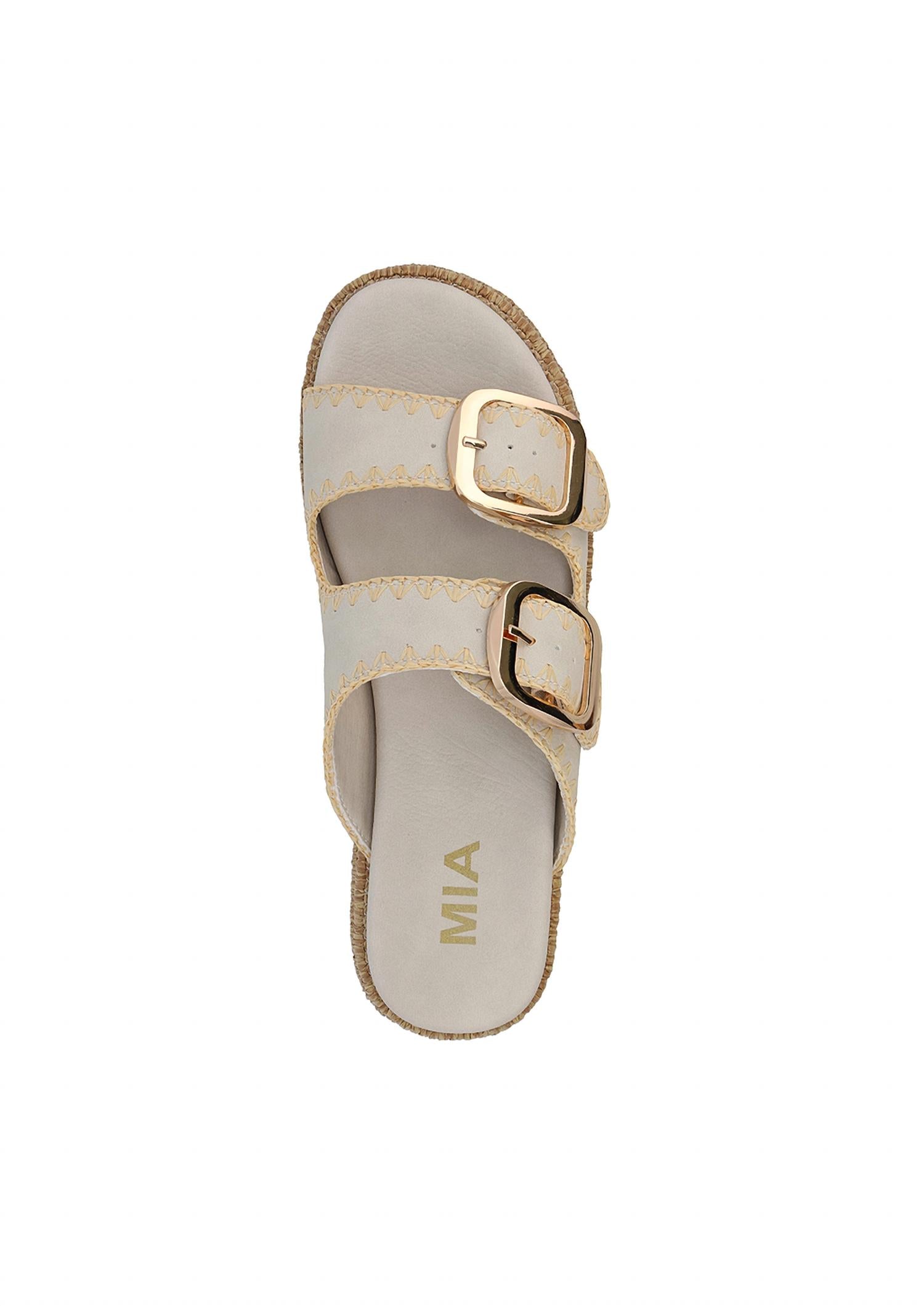Classicly cute and all-day-wearable. We love this sandal. Step confidently into vacation season with the Women's Seashell Mieko Buckle Platform Sandals by Mia Shoes. These boho-chic sandals feature a vegan leather upper in a minimalist seashell hue, with elegant stitched trim details. The standout design includes a comfortable 2-inch raffia-wrapped platform and is finished with sophisticated gold buckles. Ideal for a spring getaway, their flat heel and round toe shape ensure all-day comfort.