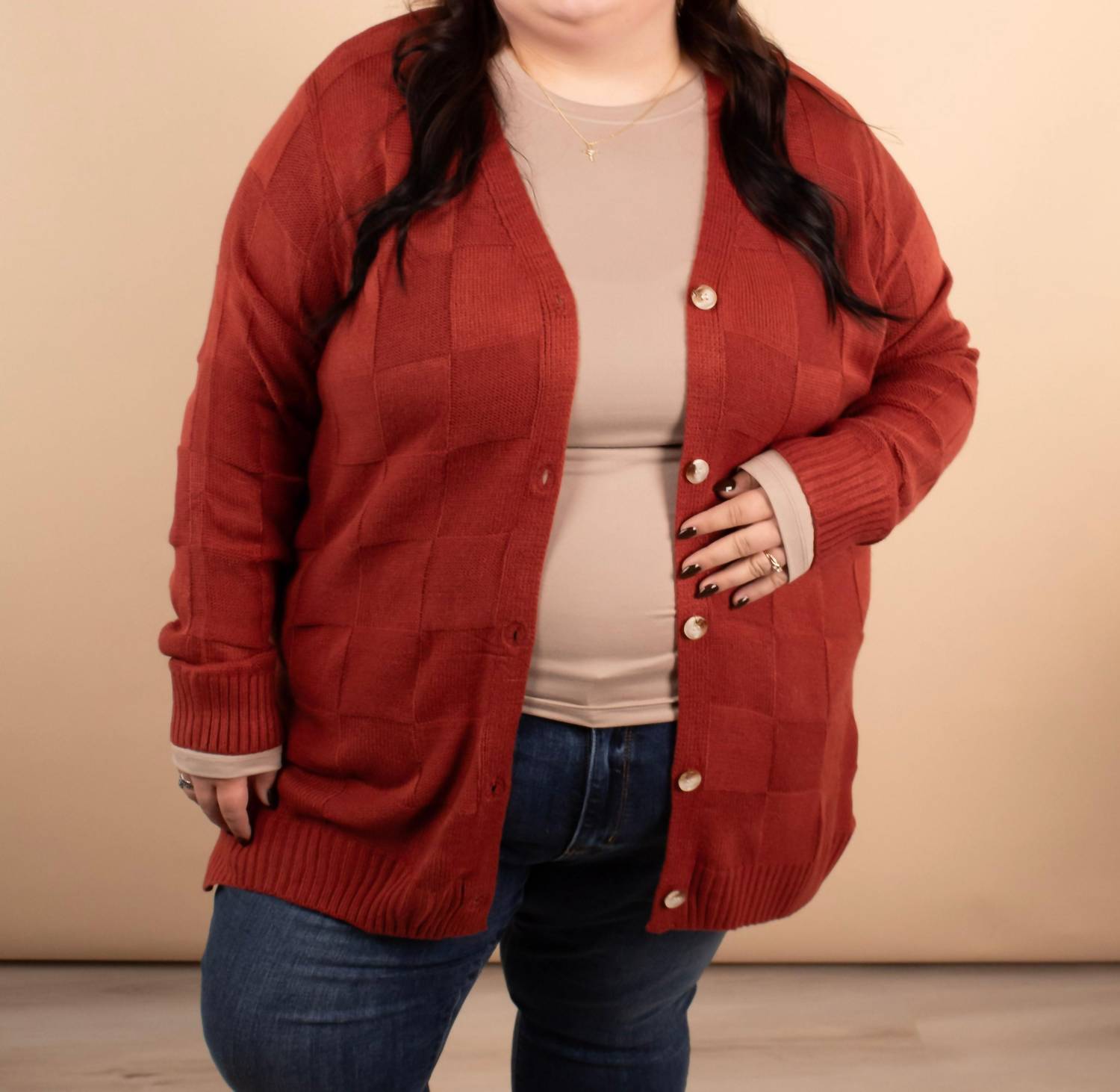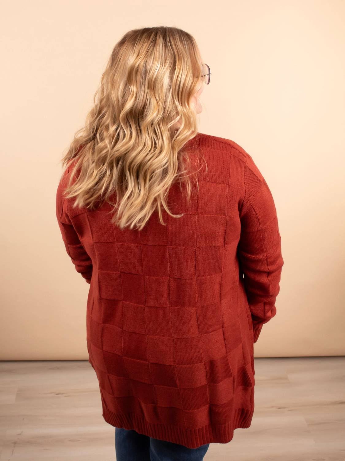 Throw this adorable cardigan over any cami or tank top. Elevate your fall wardrobe with the Sweater Season Textured Cardigan by Michelle Mae. This women's cardigan showcases long sleeves in a soft 100% acrylic knit, offering everyday comfort in a beautiful brick red hue. Designed with a V-neckline and button closure, it features a playful textured checker pattern and a slight hi-low hem, perfect for layering over leggings or jeans. Care for this cozy piece by hand washing and laying it flat to dry.