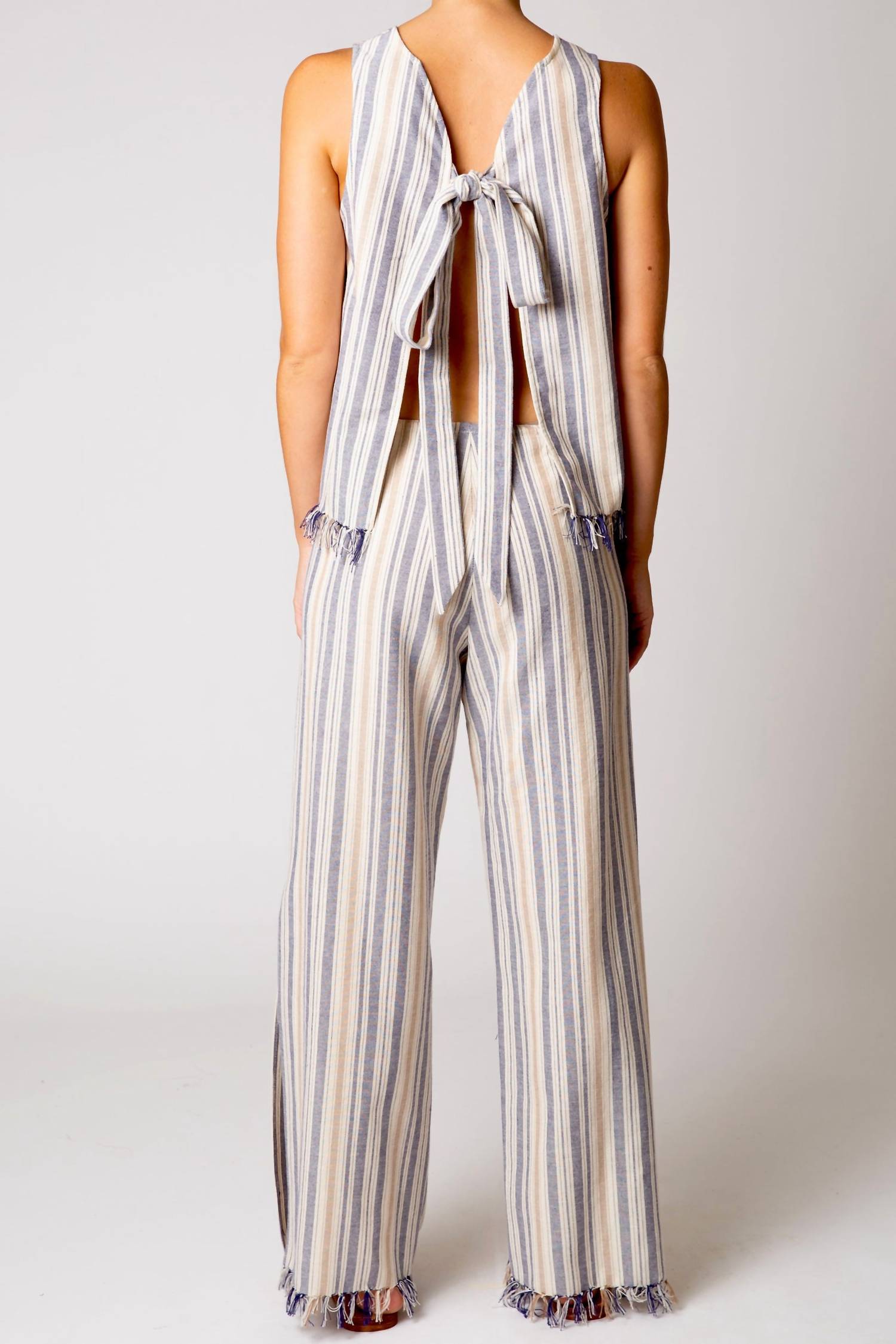 A versatile blouse that works from desk to dinner! Indulge in elegance with the Micha Striped Fringe Top by Miguelina, featuring a sleeveless design crafted from 100% organic cotton in the tranquil Portofino hue. This imported blouse offers a chic, flowy silhouette with an open back and a self-tie closure that adds a touch of sophistication. The hand-fringed hem complements its boho-chic style, making it the perfect vacation staple. Easy to care for, simply hand wash to maintain its pristine condition.