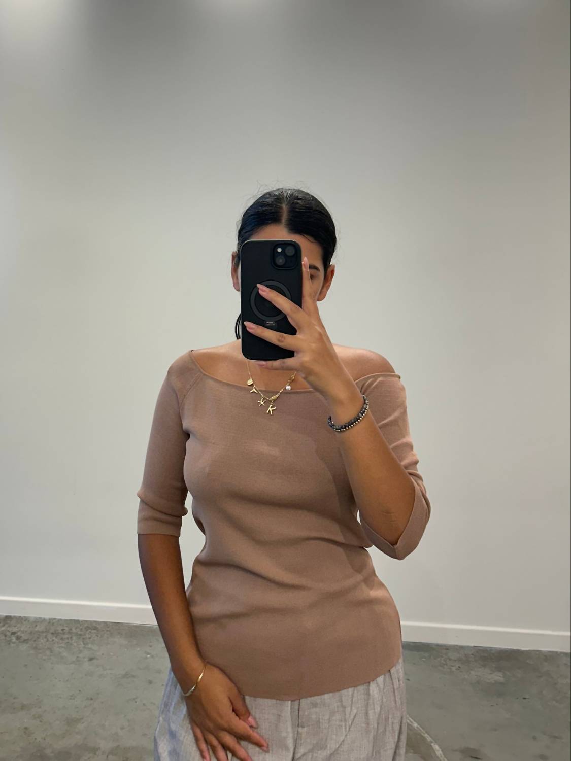 A timeless blouse that will never go out of style. Meet the Off The Shoulder Knit Top by Mijeong Park, a minimalist and sophisticated piece perfect for spring evening events. This women's blouse features short sleeves and an elegant off-the-shoulder neckline in a solid camel hue. Its pull-on design ensures effortless wear, while the composition remains a mystery, adding to its unique appeal. For optimal care, please dry clean only.