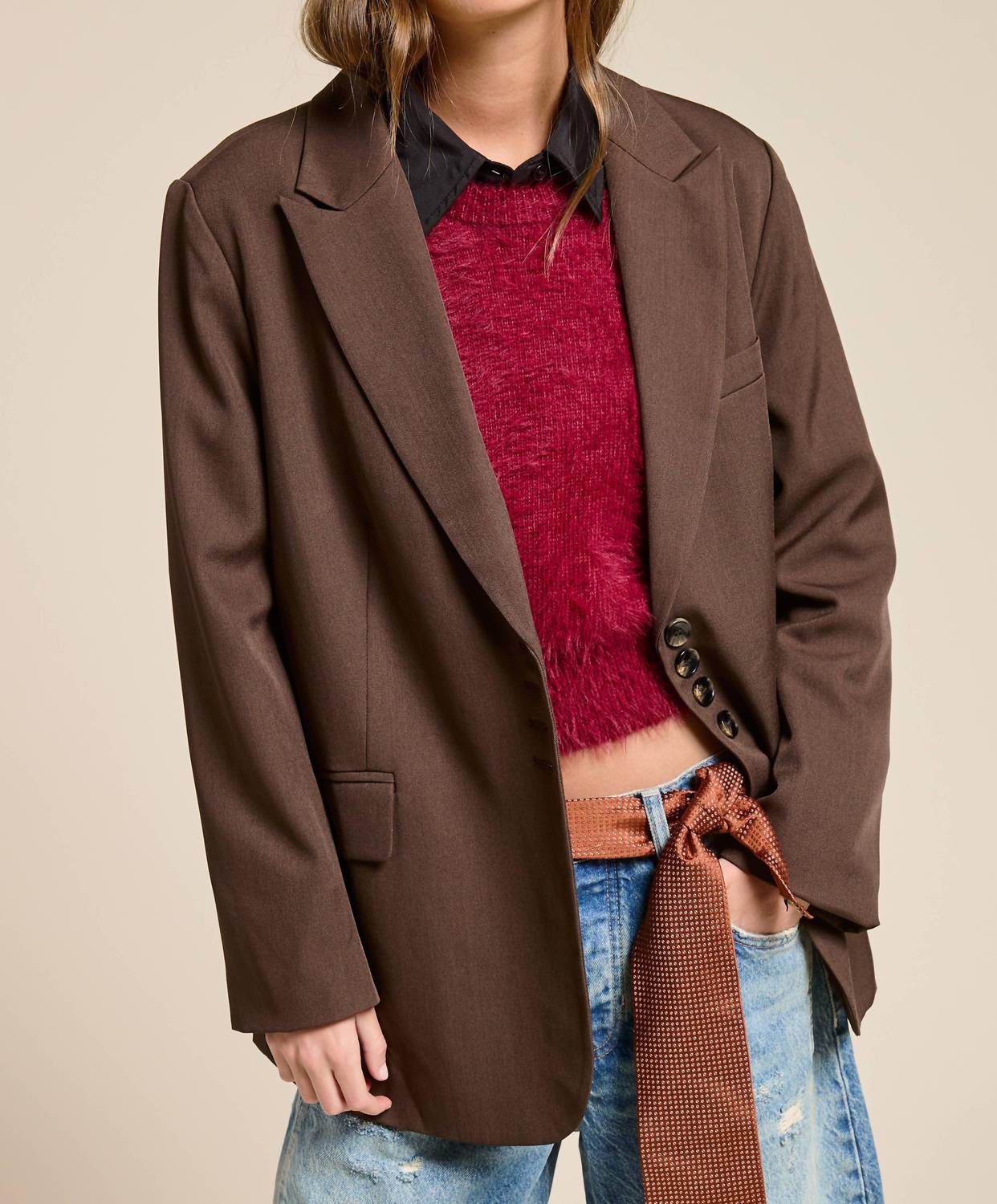 An elevated version of your favorite classic blazer. Elevate your wardrobe with the Women's Adjustable Tie Back Blazer Jacket by Mimosa, a piece that blends sophistication with a modern twist in a solid brown hue. Featuring long sleeves and designed with a flattering tie-back detail, this blazer ensures a cinched silhouette. Closure is achieved through a front button, while the refined notched lapels and flap pockets add a touch of elegance. Crafted for versatility, it’s perfect for layering over workwear or casual basics for any spring occasion.
