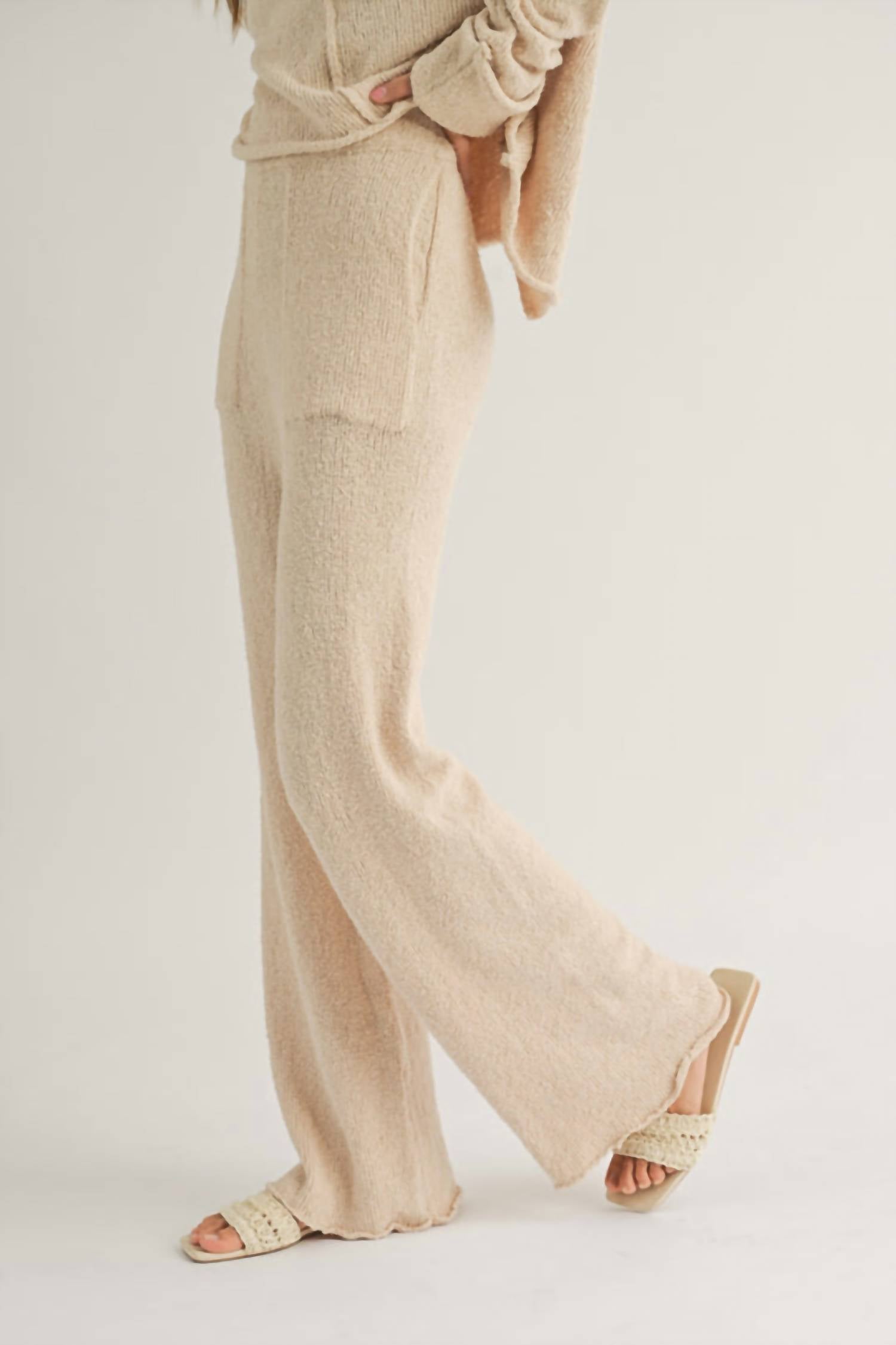 The Helena Sweater Pants by MIOU MUSE are your go-to for stylish lounging and comfort. These cream-colored pants feature a high-rise with an elastic waistband and a wide-leg fit that flatters various silhouettes. Crafted from 70% Cotton and 30% Nylon, they boast a textured pattern with raw hem details and convenient pockets. Closure: Pull on. Care: Hand wash cold water, lay flat to dry. Available in sizes Small (US 0-4), Medium (US 4-8), and Large (US 8-12).