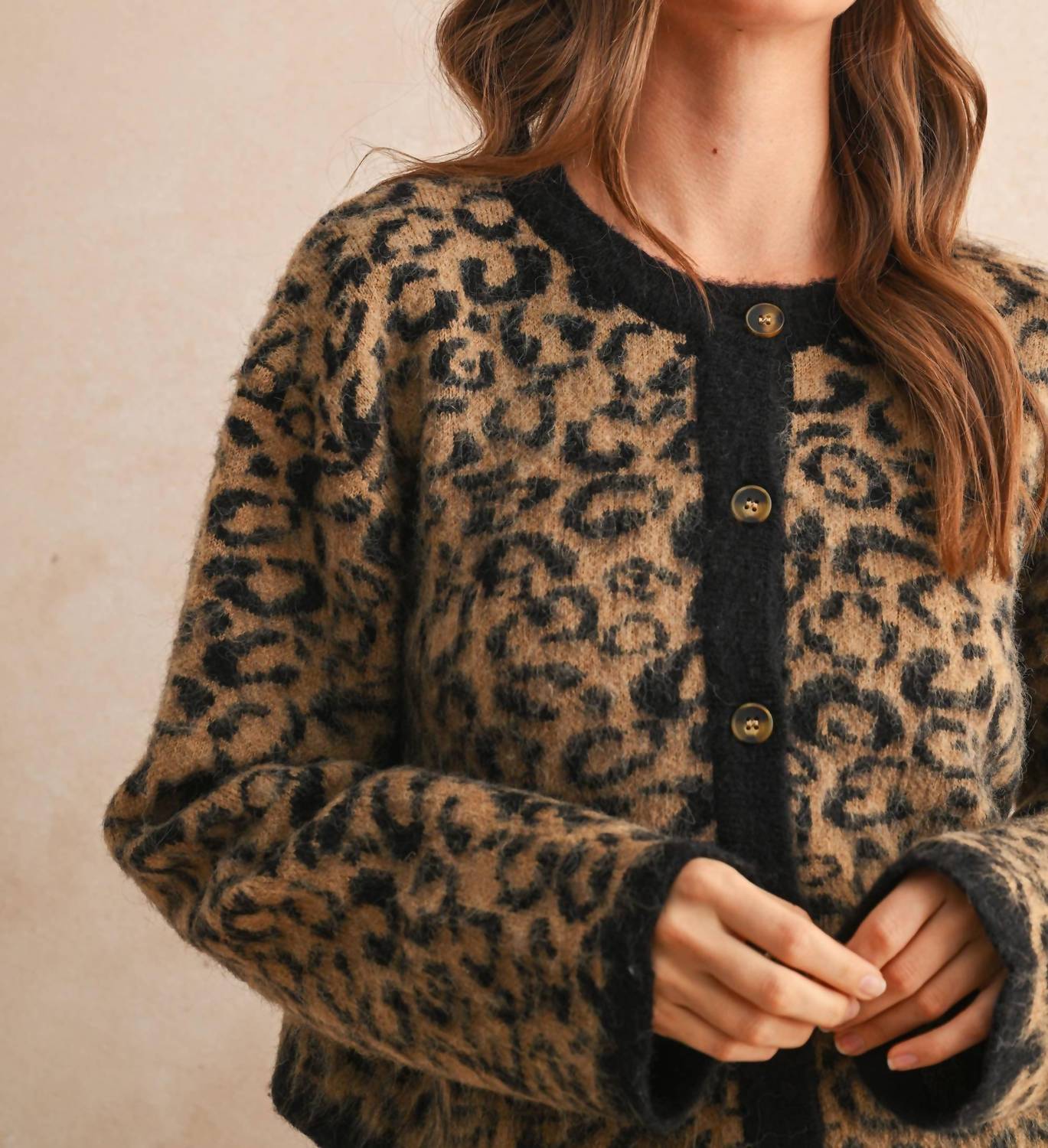 This cardigan will be a sweater-rotation favorite. Elevate your fall wardrobe with the Leopard Print Sweater Cardigan by MIOU MUSE, a chic addition for any evening event. This brown cardigan features a striking animal pattern and long sleeves, perfect for layering. It highlights a crewneck and convenient button closure for easy wear. Made for machine wash care, this piece combines style with utility. Model is wearing size S (5'7.5" height, 33" bust, 24" waist, 34" hips).