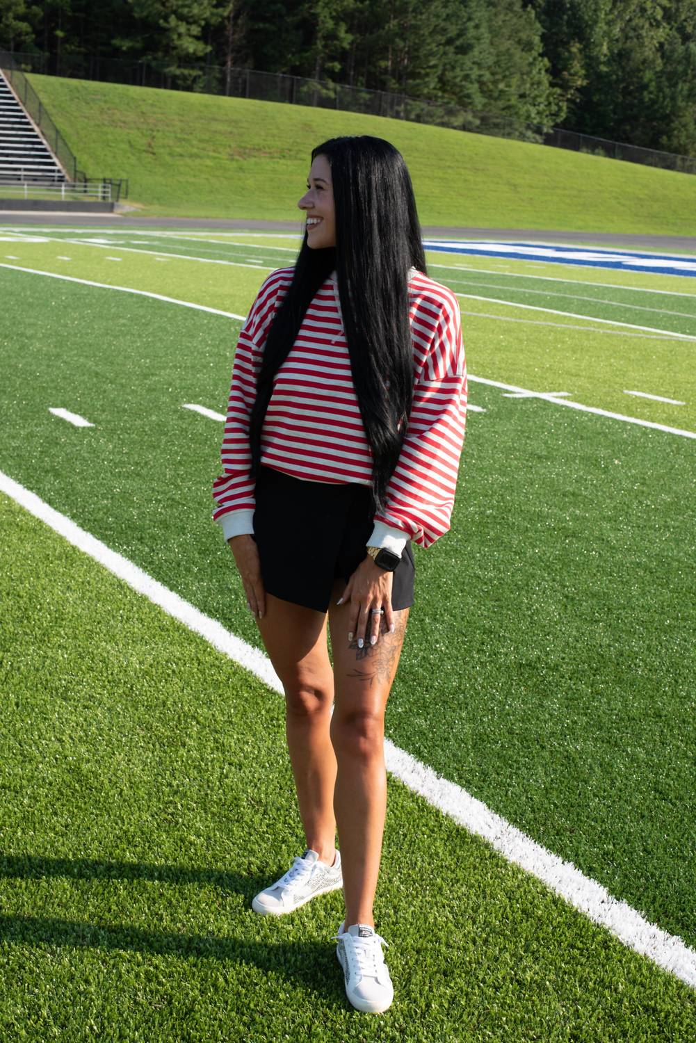 Experience the perfect blend of comfort and style with this trendy crew neck sweater, designed to effortlessly elevate your wardrobe. Pair it with your favorite denim and loafers for the perfect look. Introducing the Women's Stripe Knit Pullover by MIOU MUSE, a versatile choice for both game day and everyday travel. This long sleeve knit pullover features a classic crewneck design and a striking red and heather grey striped pattern, perfect for minimalist fall styling. The material ensures a comfortable fit and easy, pull-on closure, while the activewear-inspired design promises ease of movement. Care for this essential piece with machine washing to maintain its timeless appeal.