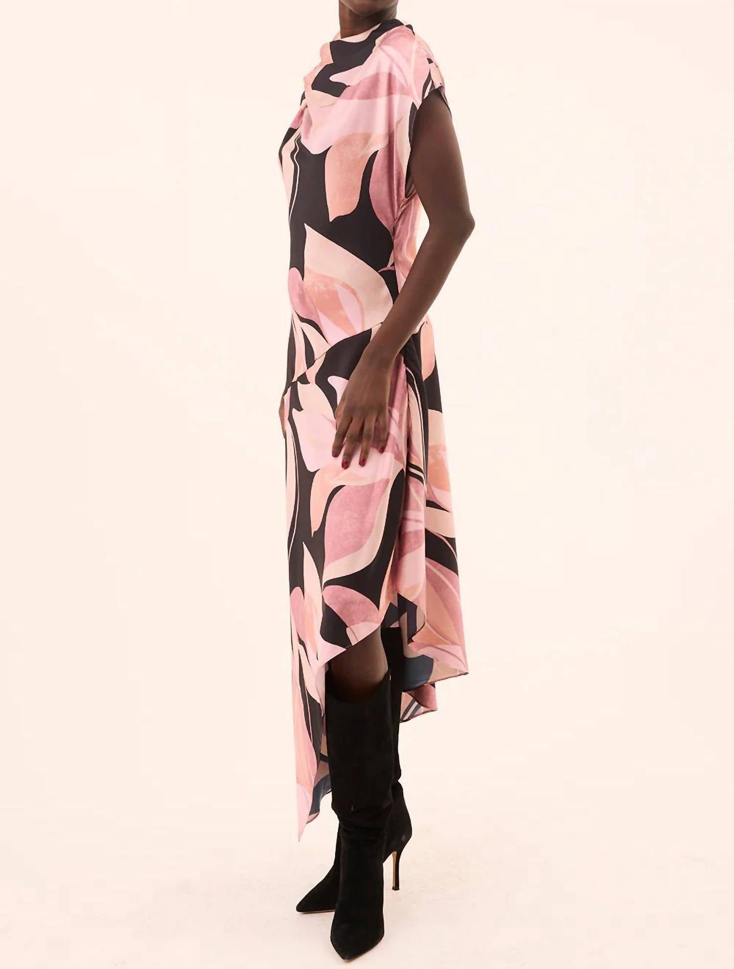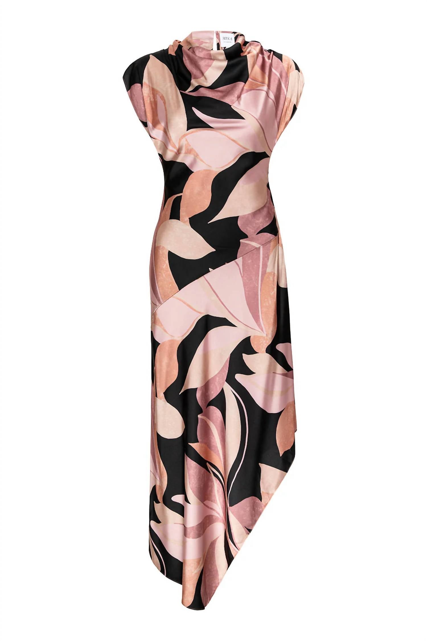 A midi dress so versatile, your options for wearing it are endless. Discover the Sally Midi Dress by Misa Los Angeles, a best-seller that combines elegance and comfort in Moody Abstract Floral. This sleeveless design boasts a chic cowl neckline and an asymmetrical skirt with a dropped waist, complemented by a keyhole button closure at the back. Crafted from 100% poly satin, it offers a luxurious feel and flow. Made in the USA, this piece is perfect for spring dinner parties or Easter celebrations. Care: Dry clean only.