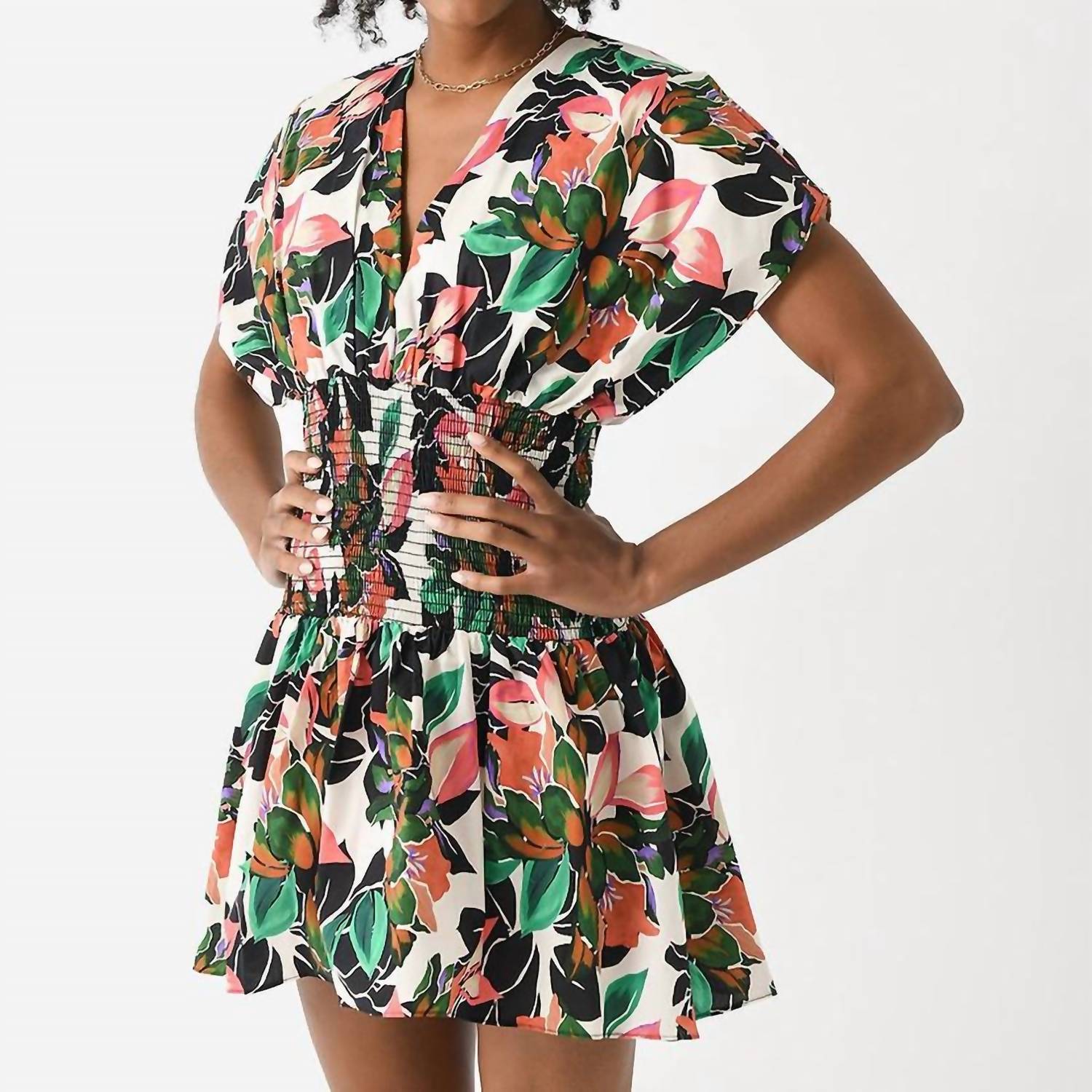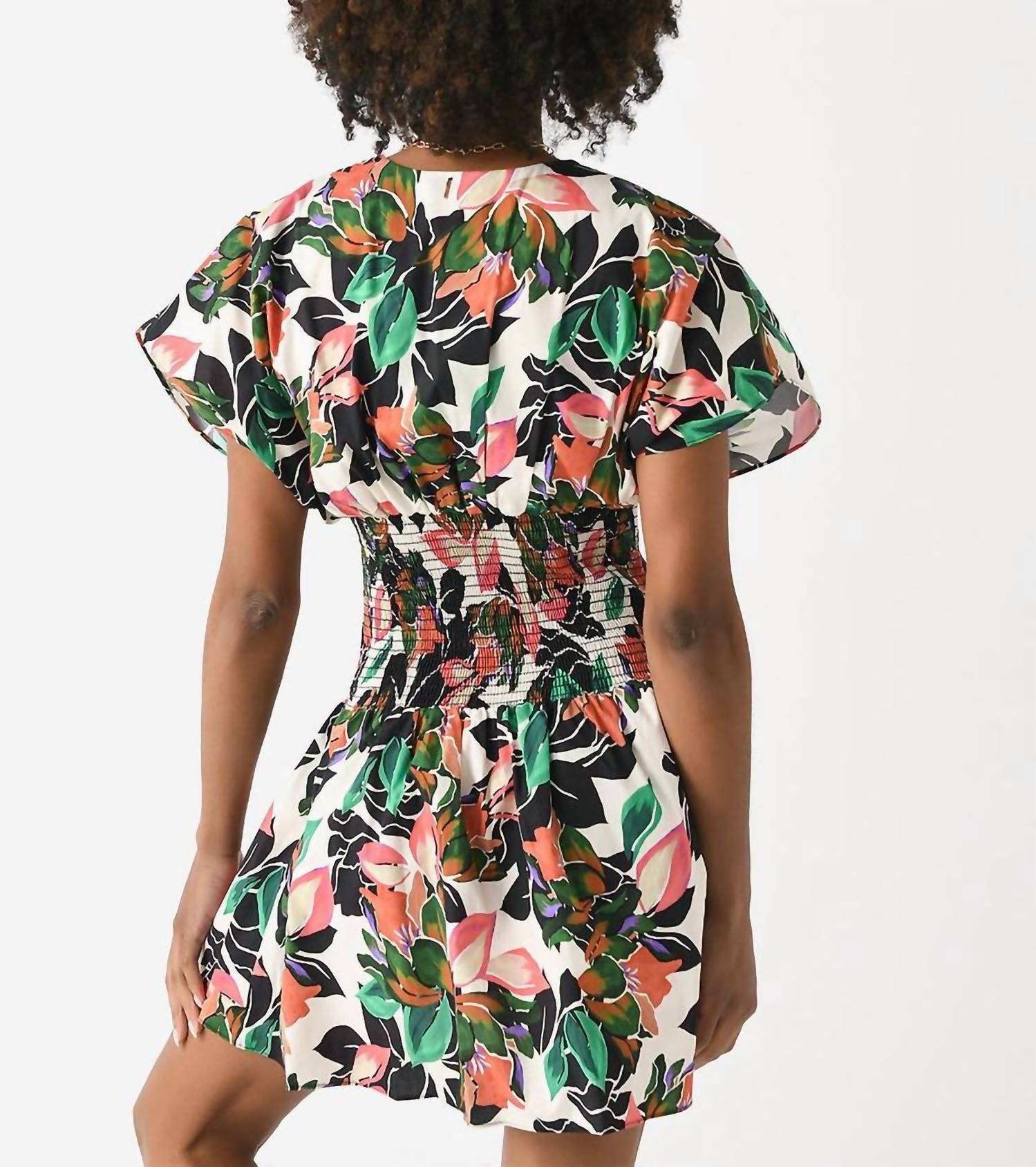 The perfect mini dress for those warmer months. This lightweight stretch poplin dress features a smocked elastic waist for a flattering fit and a softly gathered skirt that adds effortless movement. Designed with a floral print and a feminine V-neckline, it offers easy, unlined comfort. Crafted from a breathable blend of 97% cotton and 3% spandex, it’s perfect for warm-weather days.
