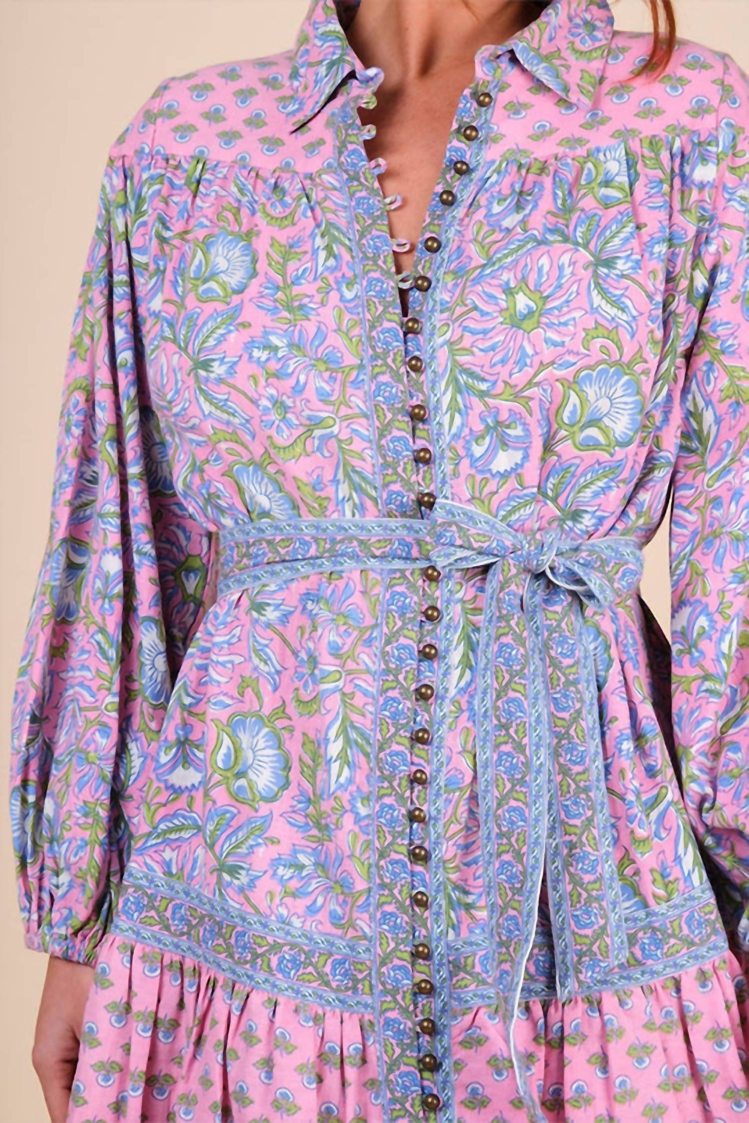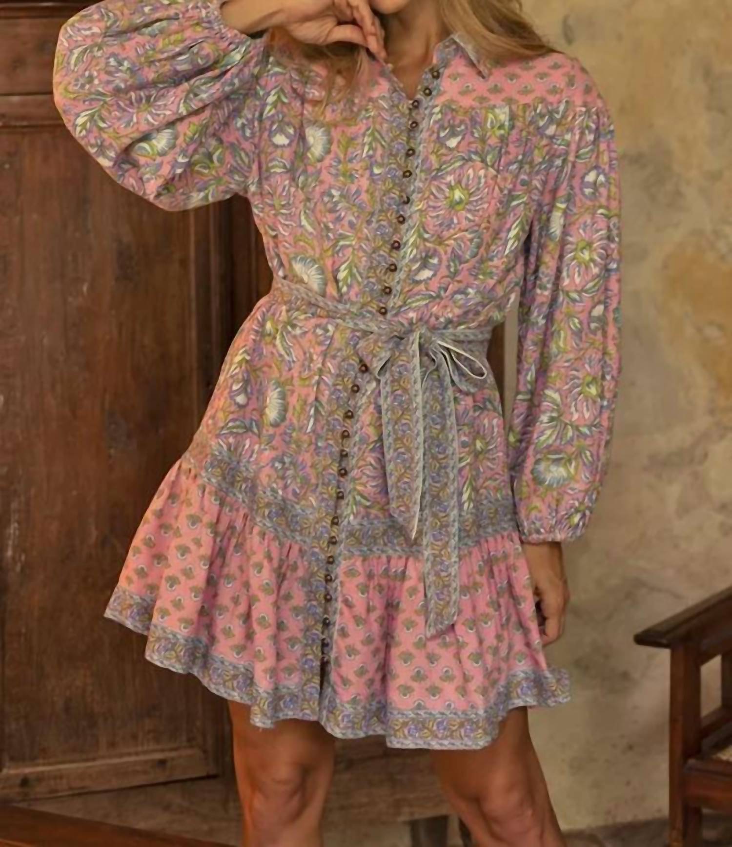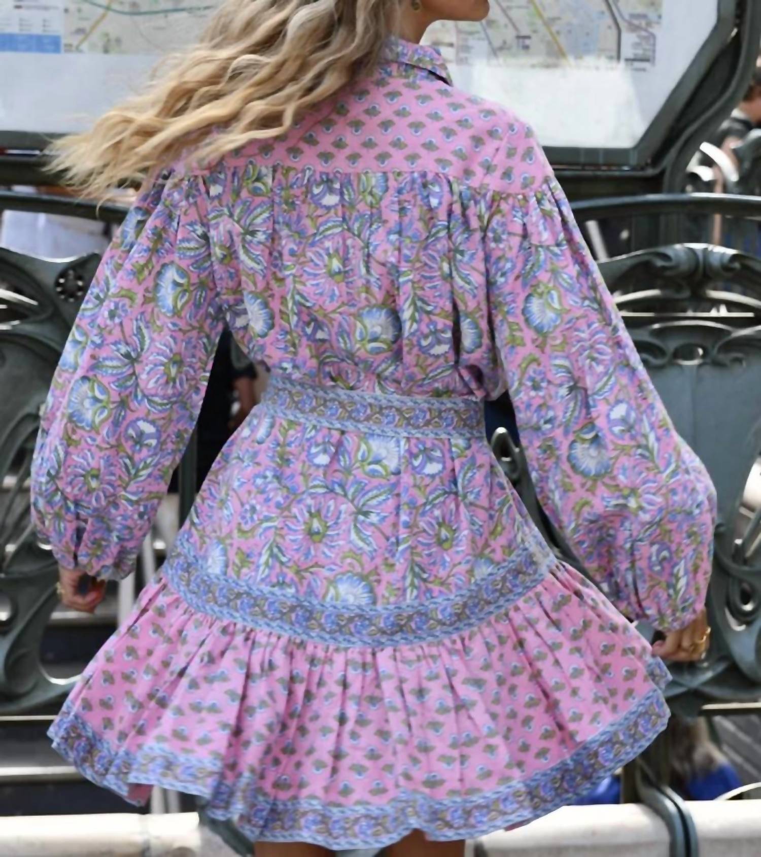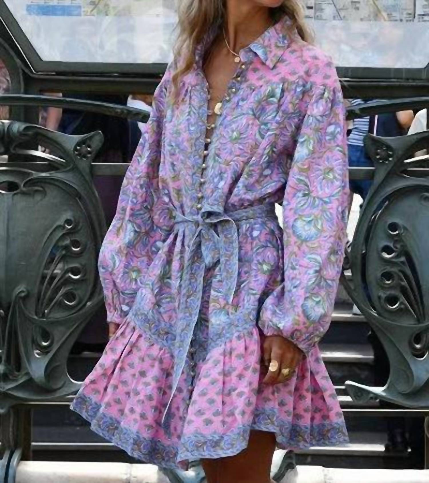 The perfect mini dress for those warmer months. Introducing the Lorena Mini Dress by Miss June Paris, a glamorous pink A-line dress that's perfect for adding a boho chic touch to your spring wardrobe. This women's dress features long sleeves and a patterned floral design with a stylish collar neckline. Made from comfortable cotton, the dress offers an elegant silhouette for your sunny getaways or Thanksgiving gatherings. Closure: Button closure. Care: Dry clean only. Available in One Size (38/42 FR).