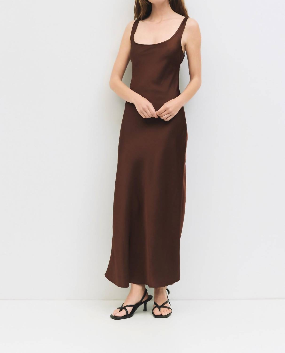 A midi dress so versatile, your options for wearing it are endless. Introducing the Saylor Dress by MOD REF, a chic choice for a dinner party with its minimalist, sleeveless slip silhouette. Crafted from 100% polyester, this brown dress features a scoopneck and fluid drape, complete with subtle binding at the neckline and armholes. Designed to fall to a midi length, it offers a sleek and sophisticated look without pockets. Closure: Pull on. Care: Hand wash.