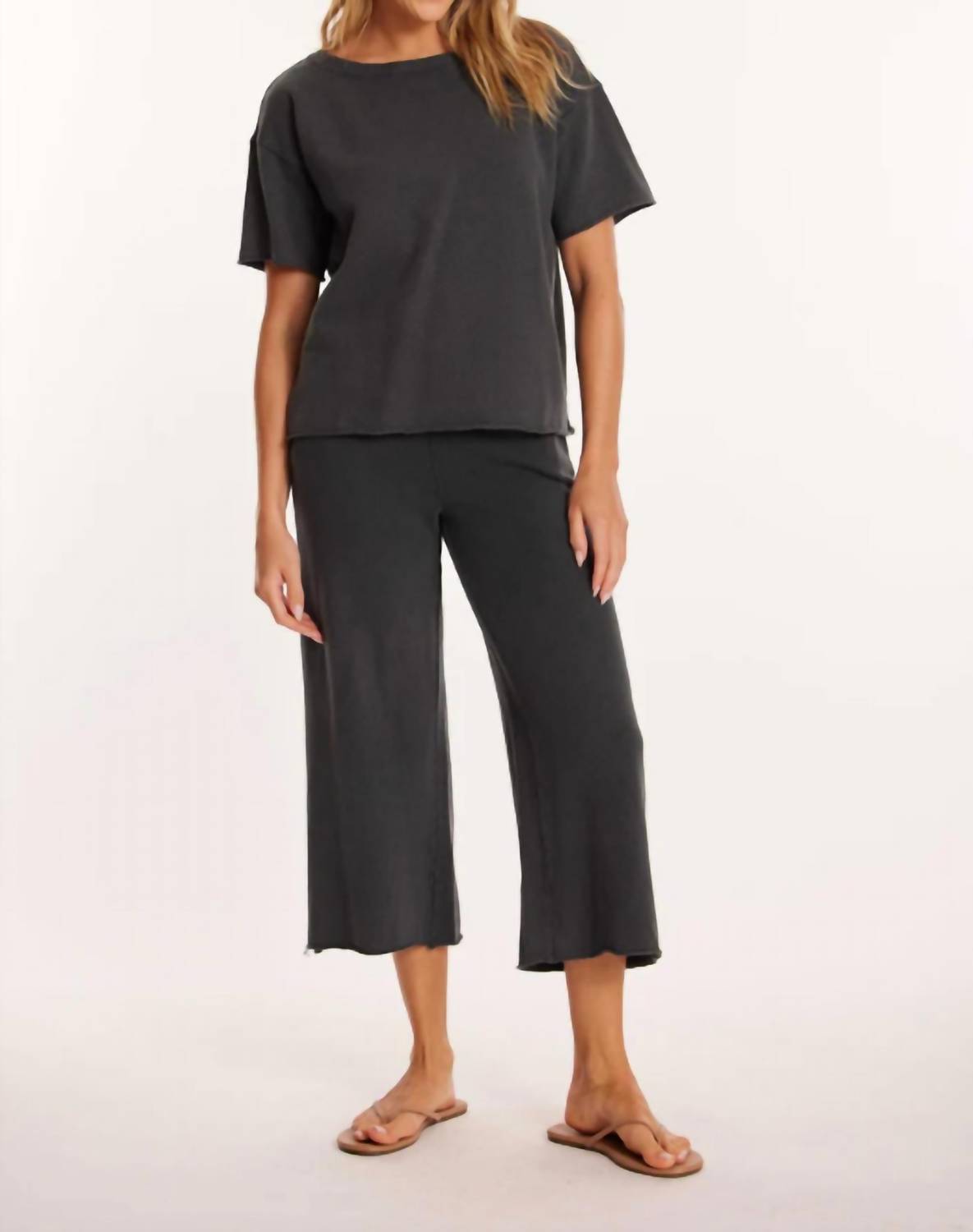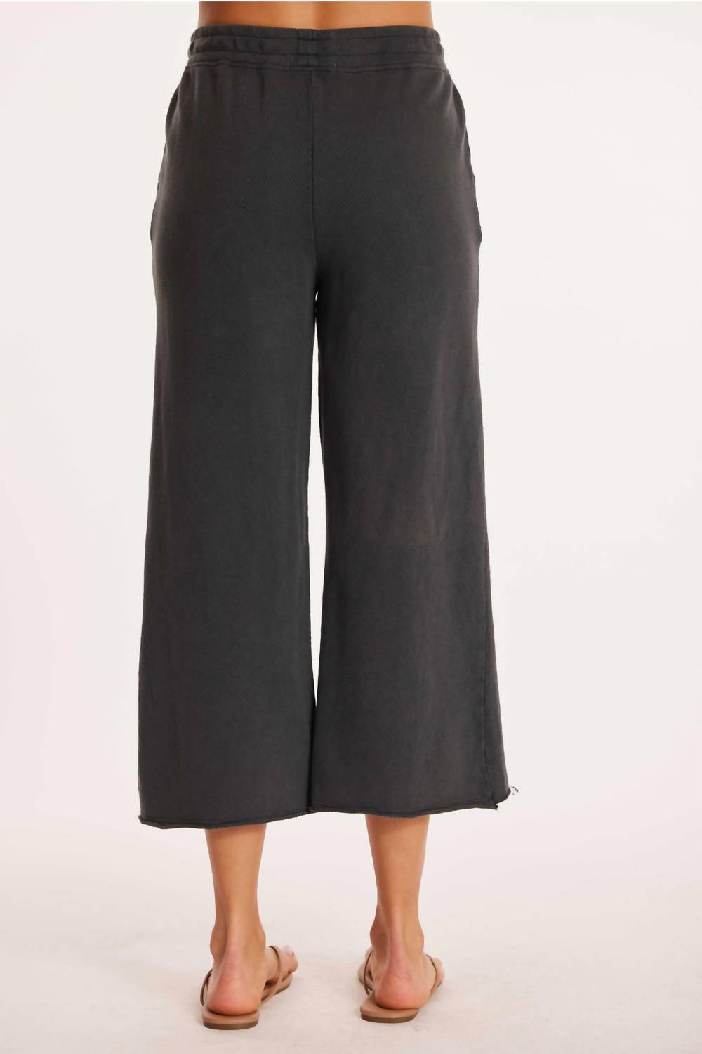 Stay on-trend and showcase your impeccable taste with these adaptable and stylish cropped pants. The perfect length to wear with your favorite mules. You'll love the fit! Experience effortless comfort with the Gathered Waist Flared Crop Pants by mododoc, a minimalist masterpiece in Washed Ebony. These cropped pants showcase a relaxed fit and flared leg style, crafted from 100% cotton terry for a textured finish. Designed with practical front pockets and a mid-rise gathered waist, they offer a pull-on closure for easy wear. Care for these versatile pants by machine washing and line drying.