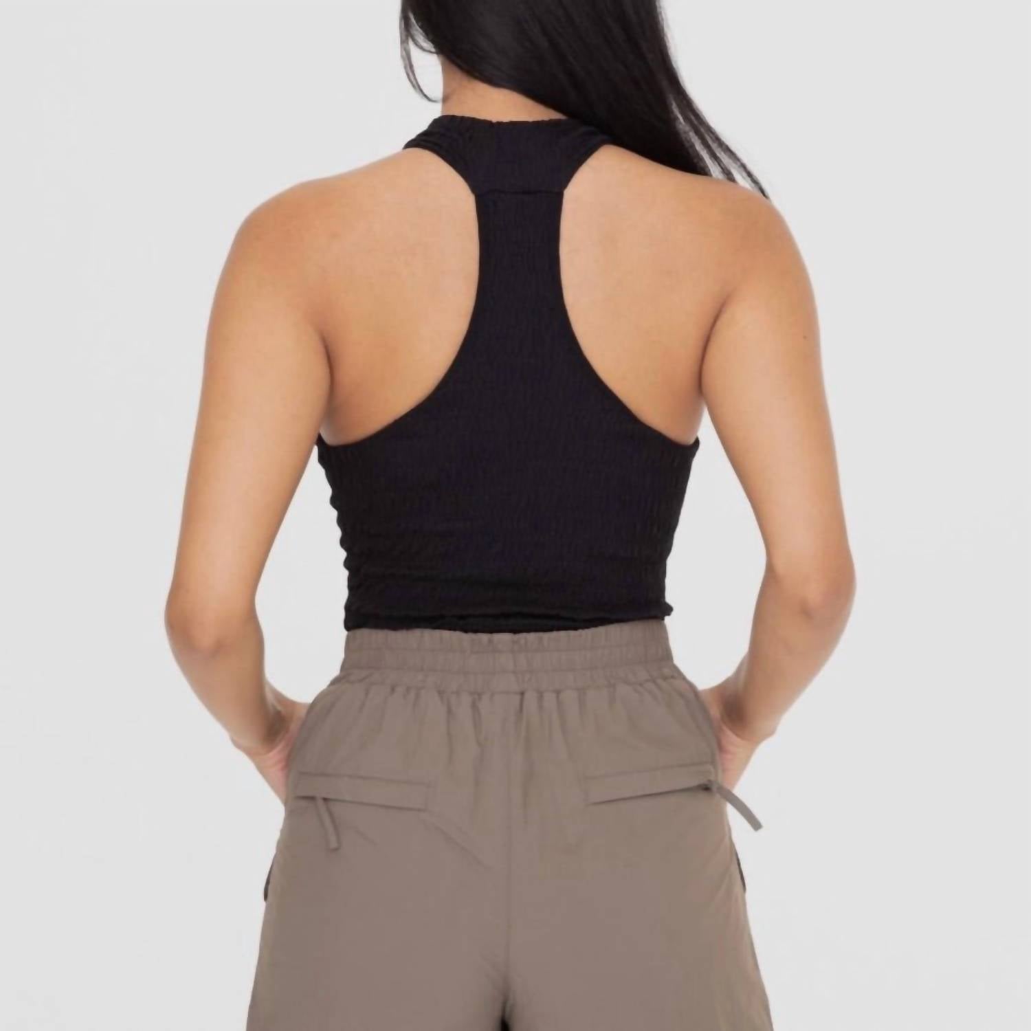 Pair this crop top with your favorite high-waisted jeans or maxi skirt. The Women's Slimming Halter Top by Mono B is a chic addition to your summer wardrobe, perfect for a sleek, minimalist look. This sleeveless crop top features a smocked halter neckline and racerback, offering a comfortable and flattering fit. Crafted from 92% nylon and 8% spandex, it provides exceptional four-way stretch and a pull-on closure. Available in solid black, this piece is true to size, making it ideal for vacation occasions.