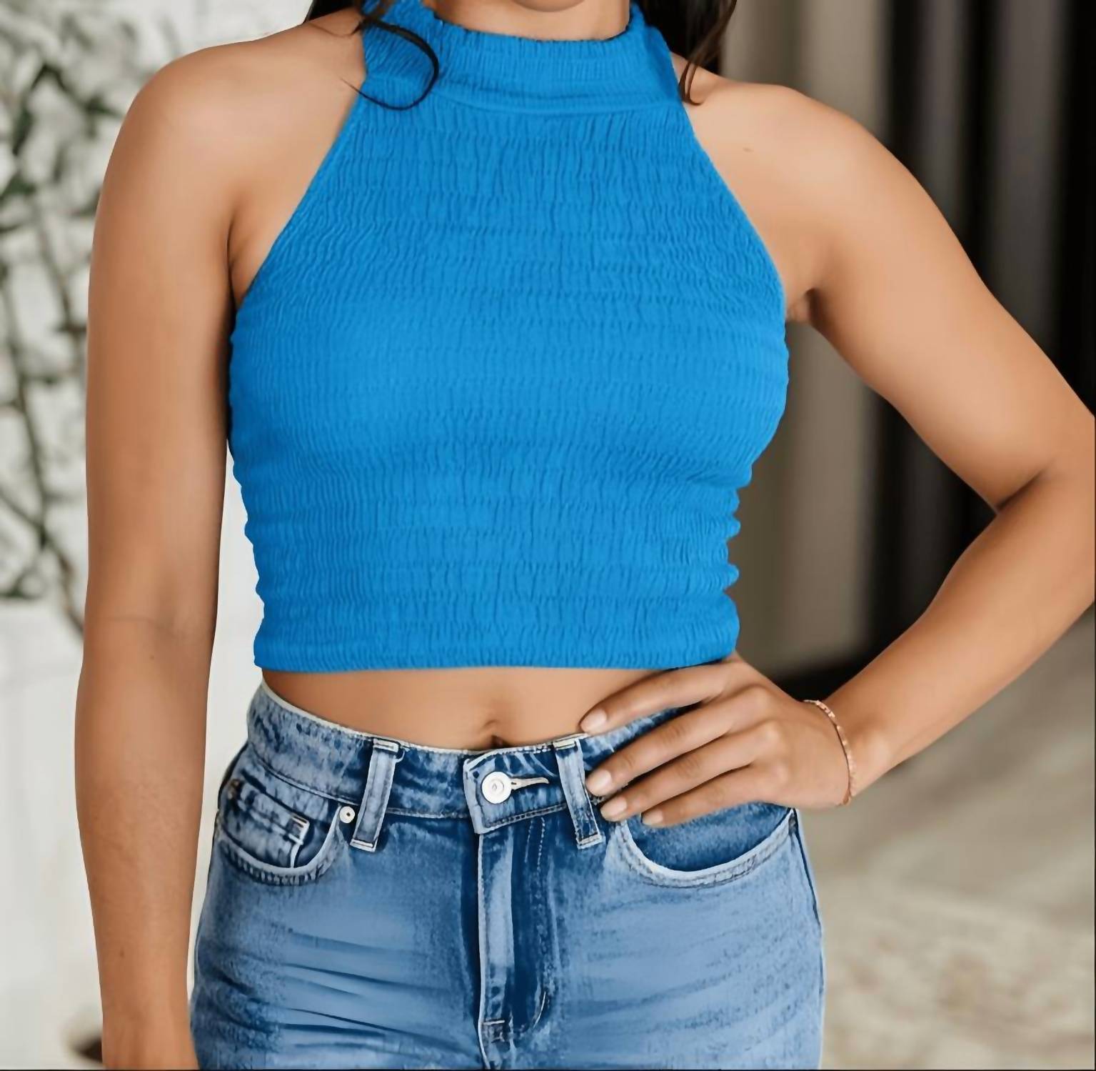 The perfect crop top for those warmer weather days. Introducing the Women's Slimming Halter Top by Mono B, a must-have in vibrant turquoise perfect for spring and vacation occasions. This crop top features spaghetti straps and a high halter neckline for a figure-flattering silhouette. Crafted from 92% nylon and 8% spandex, it offers four-way stretch and a smocked waist for added comfort. Closure: Pull-on style. Care: Machine wash. Available measurements range from size S (Bust 34-36 in, Waist 26-28 in) to size L (Bust 39-40 in, Waist 32-33 in). Ericka is 5'8", a size 4, and is wearing an S.
